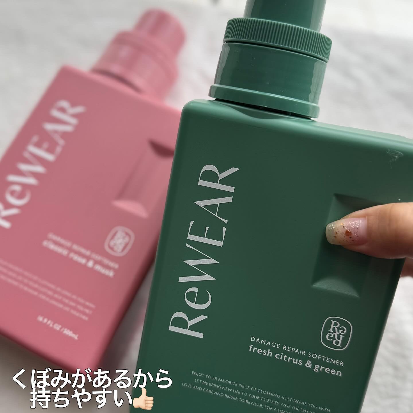 人気シャントリブランド「BOTANIST」の会社が手がける新柔軟剤ブランド『ReWEAR(リウェア)』 洗うたびに衣服をよみがえらせる※再生柔軟剤リウェアは、特徴成分であるセルラーゼ(酵素成分)のちからで毛羽立ちや毛玉を分解・除去し、色くすみも抑え、長く着続けるための衣類ケアができる柔軟剤です。 どちらも香りが良く、緑はすっきりした香り、ピンクは甘いムスクの香りがいい香り♡