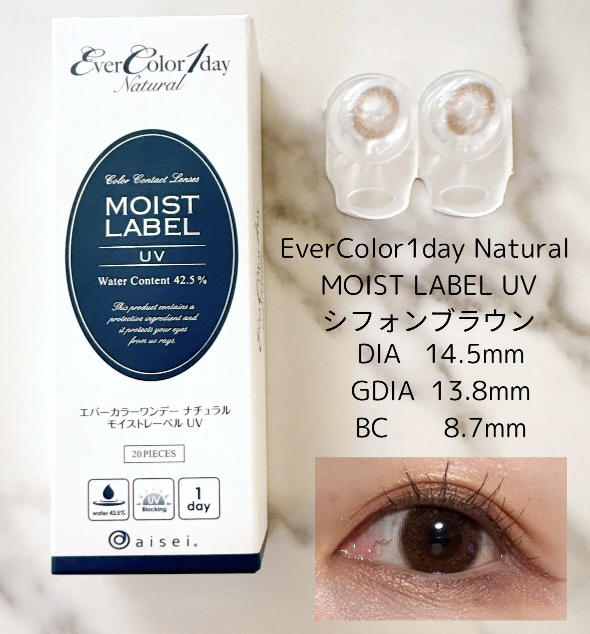 - 一歩先行く、軽い仕上がり、大人ナチュラル。 モイストレーベルUVは14.5mmで愛らしい雰囲気はそのままに瞳に馴染むナチュラル感をプラスしました。 DIA:14.5mm BC:8.7mm 中心厚:0.08mm( -3.00D ) 含水率:42.5% カラーコンタクトレンズの不適正使用による眼障害の危険性等などがあります。 ●コンタクトレンズは高度管理医療機器です。不十分な洗浄・消毒など不適切なケアや、長時間・交換期間を超えた装用により、アレルギー性結膜炎、角膜感染症、角膜潰瘍等の重篤な眼障害が発生する危険性があります ●ご使用前に取扱説明書を確認してください 使用上の留意事項 ●眼科医院等を受診してからお求めください ●眼に異常を感じたら直ちにレンズ使用を中止し、お近くの眼科等で診察を受けてください ●医師の指示にしたがってご使用ください ●コンタクトレンズを装用する場合、自覚症状がなくても、眼科医院等での定期検査を受けてください ●レンズに不具合がある場合は使用しないでください
