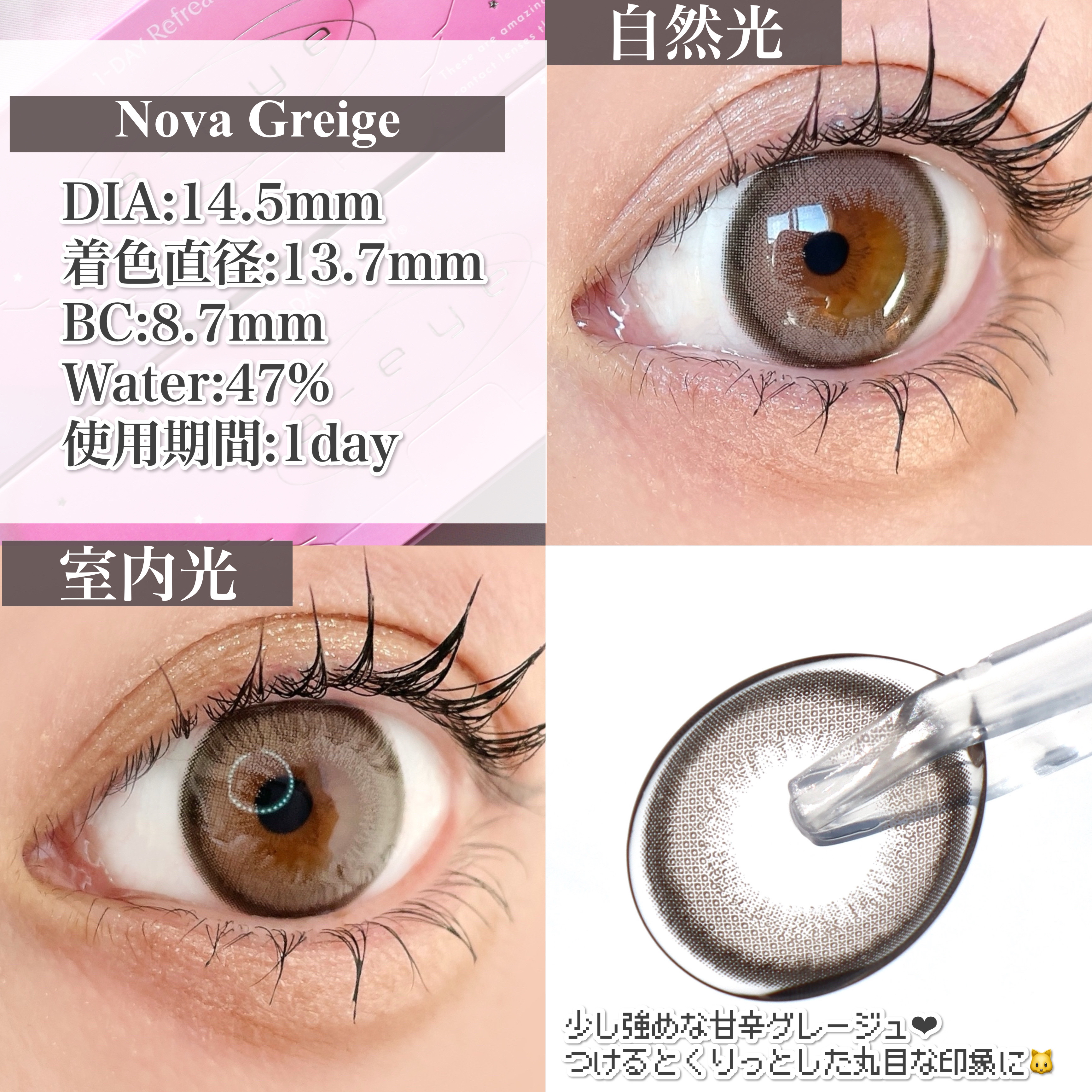 盛れるのに使用感も個人的に良かったから本当に推したい新作カラコン🥺💖💖 グレージュの絶妙な色味で抜け感も出るし、甘めにも大人クールな雰囲気にもどっちにも使える万能カラコン🪄︎︎◝✩ シリコーンハイドロゲル素材で、ワカメみたいにやわらかいレンズで個人的に着け心地が良かったから好き