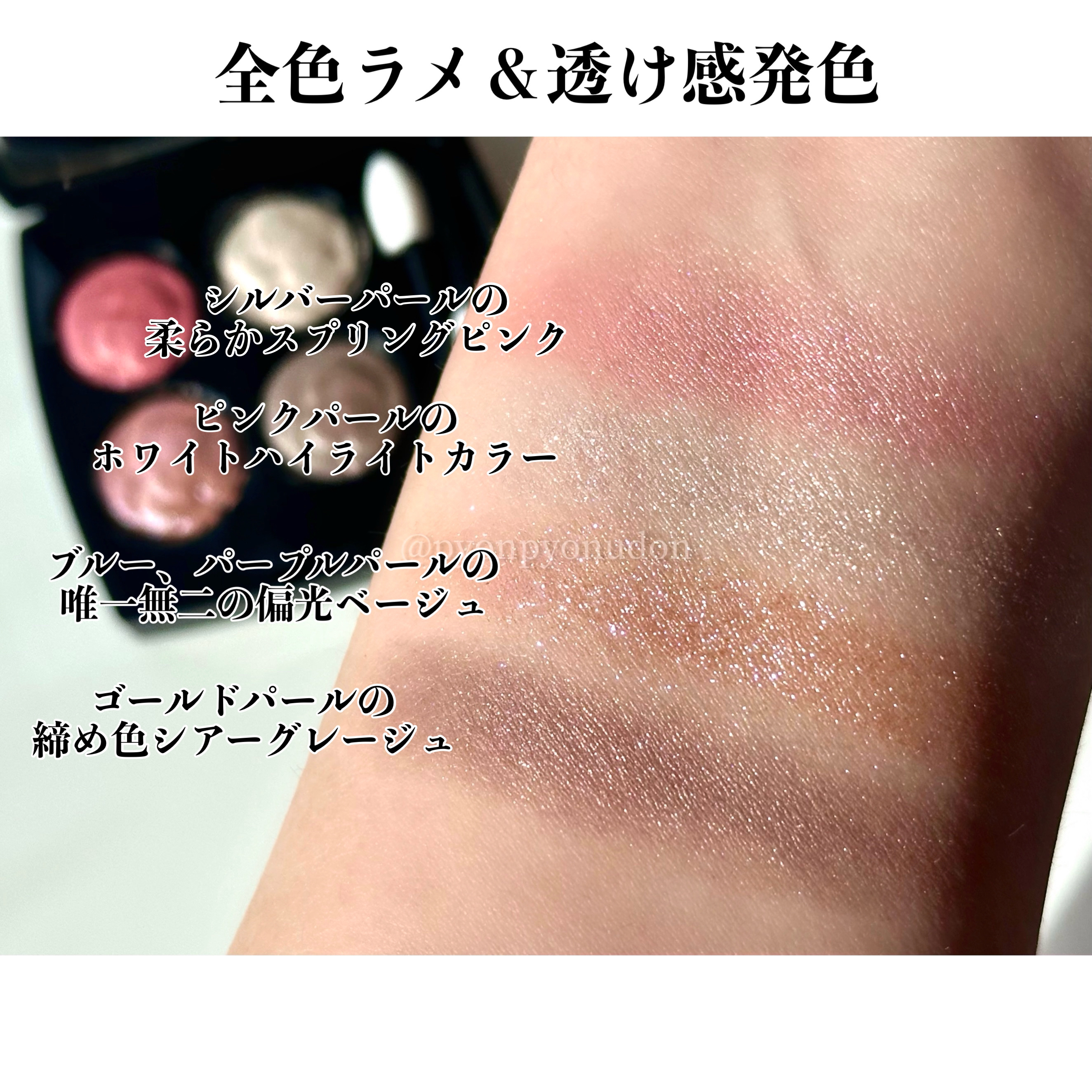 見た目は少し派手に見えるけど、スウォッチをみると透け感とラメに胸キュン💘 濃いめカラーが苦手な私でも馴染むカラーで、これはブルベが使いやすいパレットなはず。 カメリアの彫りも素敵で、使うたび心躍る春コスメです🌸 限定カラーですが、まだ公式サイトでも在庫があるので、ぜひ気になる方はチェックしてみてください。 CHANEL レ キャトル オンブル 387 ユートピア / ¥9,900