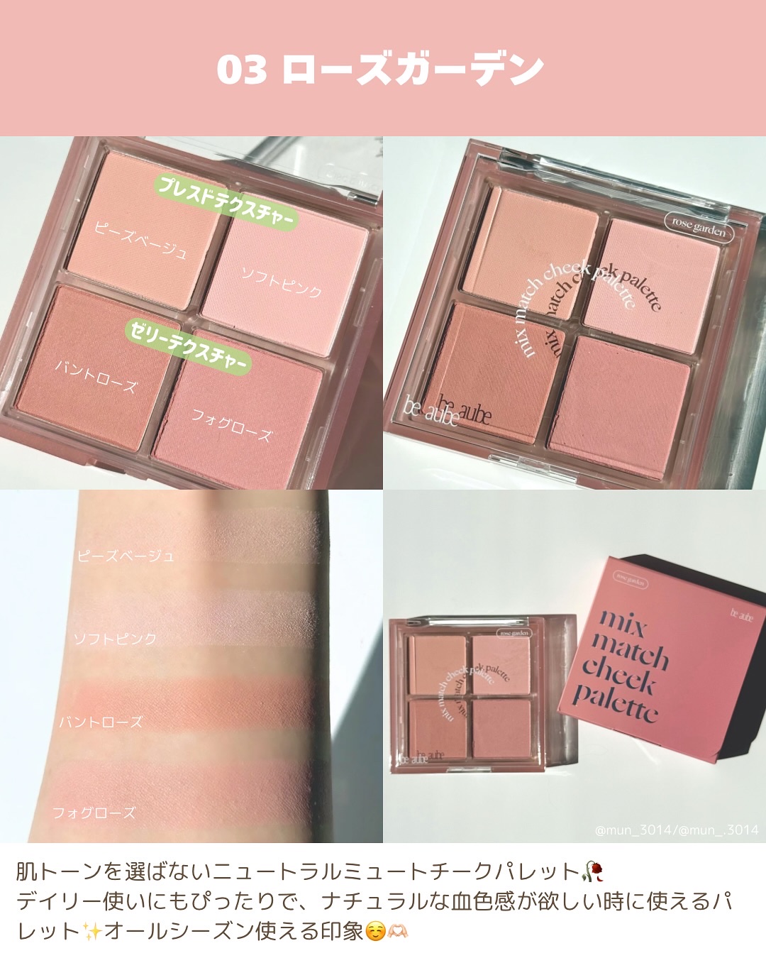 このチークパレット……めっちゃ可愛いです!!!!!! 上段2色がふんわりとした粉質のプレストチークで、下段2色がむにっとした質感のゼリーチーク。 メイクして時間が経つと「チークの色味どこいった?!」となることがありますが、こちらのチークは色持ちがとても良いです🥹💗 見た目も気分が上がる可愛いチークパレット! かなりおすすめです( 。•o•。)و✧