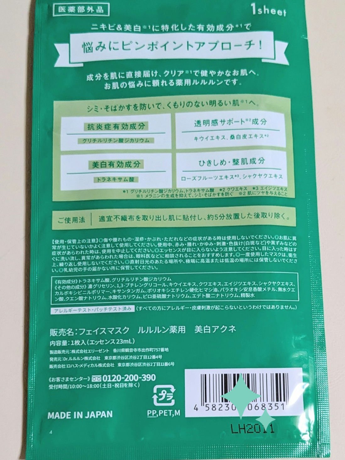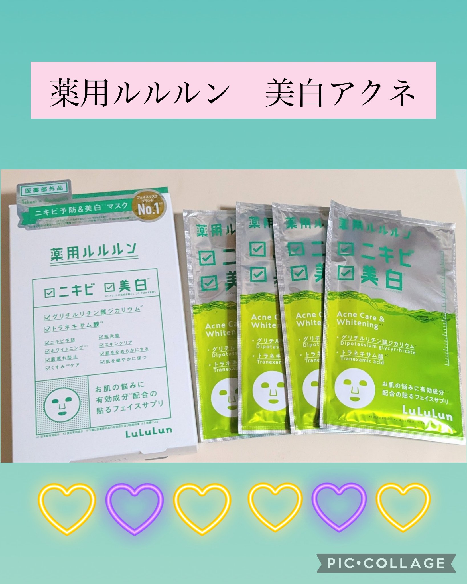 - 【医薬部外品】 ルルルン初の医薬部外品、「薬用ルルルン」が登場。 「薬用ルルルン 美白アクネ」はニキビを予防したい方、美白※1・くすみ※2をケアしたい方におすすめ。 (※1 メラニンの生成を抑えて、シミ・そばかすを防ぐ ※2乾燥による)