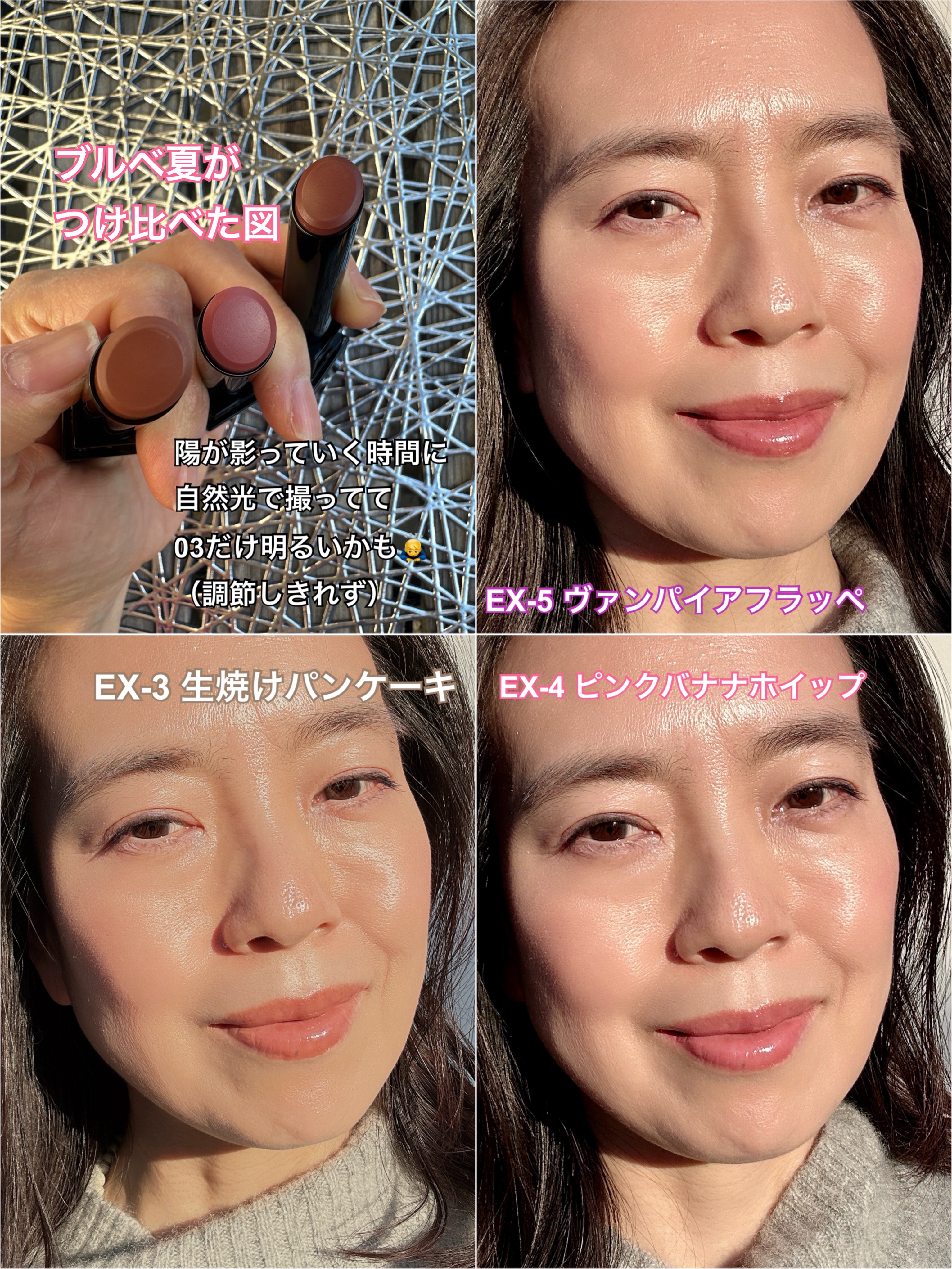 - <01 欲望の塊> テトライソステアリン酸ジペンタエリスリチル、トリ(カプリル酸/カプリン酸)グリセリル、オクチルドデカノール、ラウロイルグルタミン酸ジ(フィトステリル/オクチルドデシル)、ビスアルキル(C16-18)グリセリルウンデシルジメチコン、イソノナン酸イソトリデシル、水添ポリイソブテン、ラウロイルグルタミン酸ジ(オクチルドデシル/フィトステリル/ベヘニル)、パラフィン、合成ワックス、ダイマージリノール酸(フィトステリル/イソステアリル/セチル/ステアリル/ベヘニル)、マイクロクリスタリンワックス、水添マイクロクリスタリンワックス、ヒドロキシステアリン酸エチルヘキシル、トコフェロール、ホホバ種子油、オリーブ果実油、アーモンド油、(エチレン/プロピレン)コポリマー、ポリエチレン、ジメチコン、(+/-)(チタン/酸化チタン)焼結物、マイカ、ラウロイルアスパラギン酸Na、ラウロイルリシン、塩化亜鉛、酸化チタン、酸化鉄、水酸化Al、硫酸Ba、トリイソステアリン酸イソプロピルチタン、酸化スズ、ホウケイ酸(Ca/Al)、合成フルオロフロゴパイト、黄4、黄5、赤104(1)、赤201、赤202 <02 ピンクバナナ> テトライソステアリン酸ジペンタエリスリチル、トリ(カプリル酸/カプリン酸)グリセリル、オクチルドデカノール、ラウロイルグルタミン酸ジ(フィトステリル/オクチルドデシル)、ビスアルキル(C16-18)グリセリルウンデシルジメチコン、イソノナン酸イソトリデシル、水添ポリイソブテン、ラウロイルグルタミン酸ジ(オクチルドデシル/フィトステリル/ベヘニル)、パラフィン、合成ワックス、ダイマージリノール酸(フィトステリル/イソステアリル/セチル/ステアリル/ベヘニル)、マイクロクリスタリンワックス、水添マイクロクリスタリンワックス、ヒドロキシステアリン酸エチルヘキシル、トコフェロール、ホホバ種子油、オリーブ果実油、アーモンド油、(エチレン/プロピレン)コポリマー、ポリエチレン、ジメチコン、(+/-)(チタン/酸化チタン)焼結物、マイカ、ラウロイルアスパラギン酸Na、ラウロイルリシン、塩化亜鉛、酸化チタン、酸化鉄、水酸化Al、硫酸Ba、トリイソステアリン酸イソプロピルチタン、酸化スズ、ホウケイ酸(Ca/Al)、合成フルオロフロゴパイト、黄4、黄5、赤104(1)、赤201、赤202 <03 陽炎> テトライソステアリン酸ジペンタエリスリチル、トリ(カプリル酸/カプリン酸)グリセリル、オクチルドデカノール、ラウロイルグルタミン酸ジ(フィトステリル/オクチルドデシル)、ビスアルキル(C16-18)グリセリルウンデシルジメチコン、イソノナン酸イソトリデシル、水添ポリイソブテン、ラウロイルグルタミン酸ジ(オクチルドデシル/フィトステリル/ベヘニル)、パラフィン、合成ワックス、ダイマージリノール酸(フィトステリル/イソステアリル/セチル/ステアリル/ベヘニル)、マイクロクリスタリンワックス、水添マイクロクリスタリンワックス、ヒドロキシステアリン酸エチルヘキシル、トコフェロール、ホホバ種子油、オリーブ果実油、アーモンド油、(エチレン/プロピレン)コポリマー、ポリエチレン、ジメチコン、(+/-)(チタン/酸化チタン)焼結物、マイカ、ラウロイルアスパラギン酸Na、ラウロイルリシン、塩化亜鉛、酸化チタン、酸化鉄、水酸化Al、硫酸Ba、トリイソステアリン酸イソプロピルチタン、酸化スズ、ホウケイ酸(Ca/Al)、合成フルオロフロゴパイト、黄4、黄5、赤104(1)、赤201、赤202 <04 パンプキンワイン> テトライソステアリン酸ジペンタエリスリチル、トリ(カプリル酸/カプリン酸)グリセリル、オクチルドデカノール、ラウロイルグルタミン酸ジ(フィトステリル/オクチルドデシル)、ビスアルキル(C16-18)グリセリルウンデシルジメチコン、イソノナン酸イソトリデシル、水添ポリイソブテン、ラウロイルグルタミン酸ジ(オクチルドデシル/フィトステリル/ベヘニル)、パラフィン、合成ワックス、ダイマージリノール酸(フィトステリル/イソステアリル/セチル/ステアリル/ベヘニル)、マイクロクリスタリンワックス、水添マイクロクリスタリンワックス、ヒドロキシステアリン酸エチルヘキシル、トコフェロール、ホホバ種子油、オリーブ果実油、アーモンド油、(エチレン/プロピレン)コポリマー、ポリエチレン、ジメチコン、(+/-)(チタン/酸化チタン)焼結物、マイカ、ラウロイルアスパラギン酸Na、ラウロイルリシン、塩化亜鉛、酸化チタン、酸化鉄、水酸化Al、硫酸Ba、トリイソステアリン酸イソプロピルチタン、酸化スズ、ホウケイ酸(Ca/Al)、合成フルオロフロゴパイト、黄4、黄5、赤104(1)、赤201、赤202 <05 ダークフィグ> テトライソステアリン酸ジペンタエリスリチル、トリ(カプリル酸/カプリン酸)グリセリル、オクチルドデカノール、ラウロイルグルタミン酸ジ(フィトステリル/オクチルドデシル)、ビスアルキル(C16-18)グリセリルウンデシルジメチコン、イソノナン酸イソトリデシル、水添ポリイソブテン、ラウロイルグルタミン酸ジ(オクチルドデシル/フィトステリル/ベヘニル)、