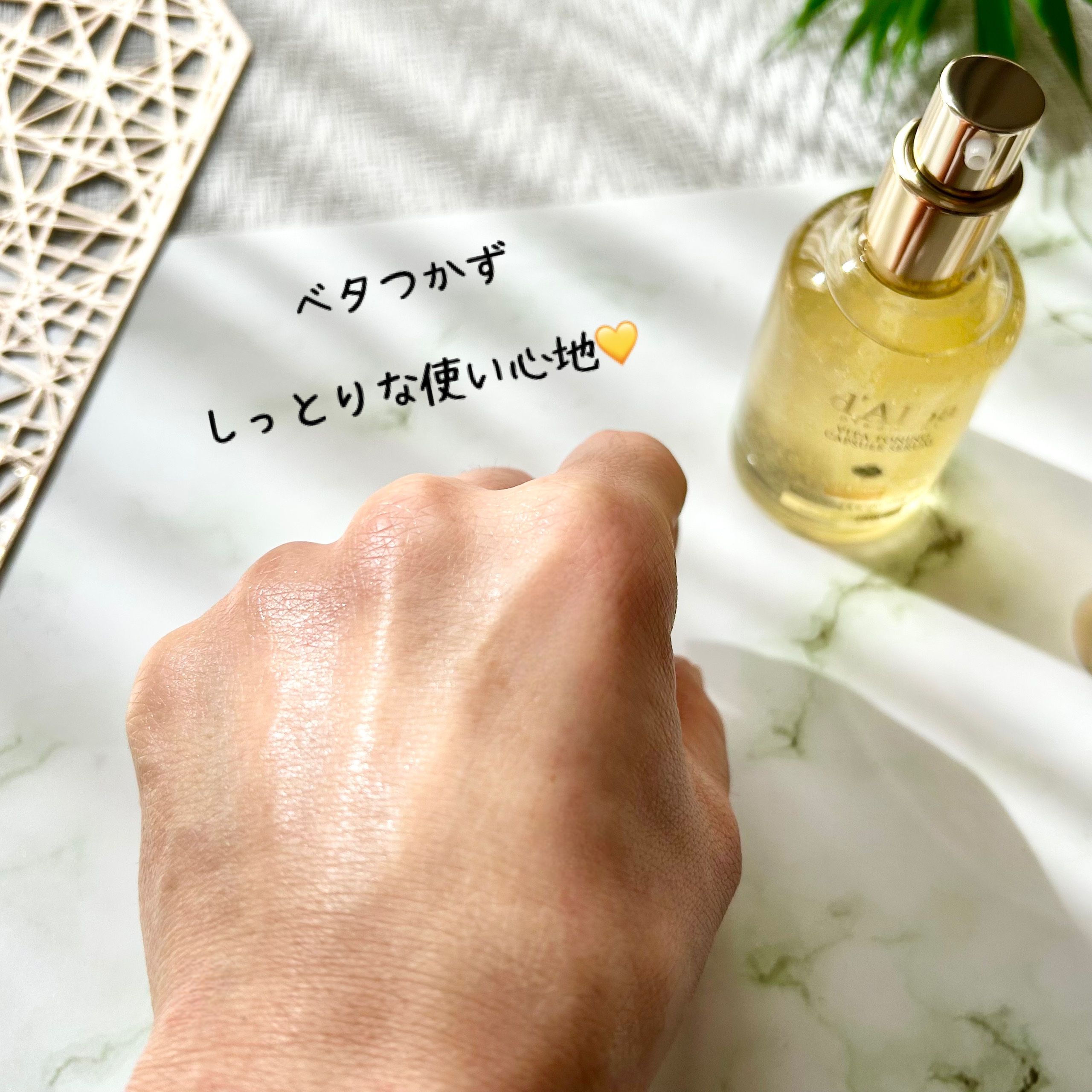 しっとりな使い心地がうれしい💛 高級感のあるガラスボトルがとっても素敵です! オイル層とローション層に分かれてるのでまずはよ~く振ってから使ってね。 オイルが入っているとは思えないようなサラッとしたテクスチャー✨ なじませると、みずみずしく しっとりとした使い心地です🤍 肌にほどよいツヤ感が出るので、ツヤ肌メイク好きの方にも向いている思う! 9つのフリー処方なのも、ゆらぎ肌にはうれしい処方だよね。