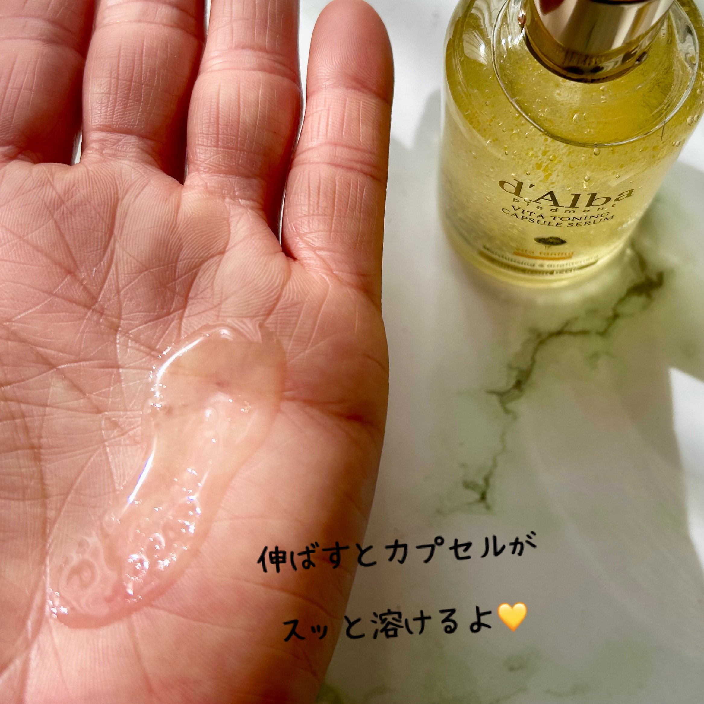 - 肌を明るくする4万*Vitaカプセルで透き通った華やかなビタトーニング べたつかずなめらかなビタミンカプセルセラム *本品容量100ml基準(製造バラつきあり、内部算出基準) 水分で満たされたふっくらとした水分ベースとビタミンカプセルが素早くブレンドされ水分膜を形成し、べたつかず、なめらかな仕上がり 【ご使用方法】 洗顔後、適量を手にとり、肌のキメに沿ってやさしくのばした後、軽くたたいて吸収させます。 TIP.2~3回レイヤリングすると、保湿·栄養集中ケアに役立ちます。 【使用上の注意】 お肌に異常が生じていないかよく注意して使用してください。 化粧品がお肌に合わないとき即ち次のような場合には、使用を中止してください。そのまま使用を続けますと、症状を悪化させることがありますので、皮ふ科専門医等にご相談されることをおすすめします。 (1)使用中、赤味、はれ、かゆみ、刺激、色抜け(白斑等)や黒ずみ等の異常があらわれた場合 (2)使用したお肌に、直射日光があたって(1)のような異常があらわれた場合