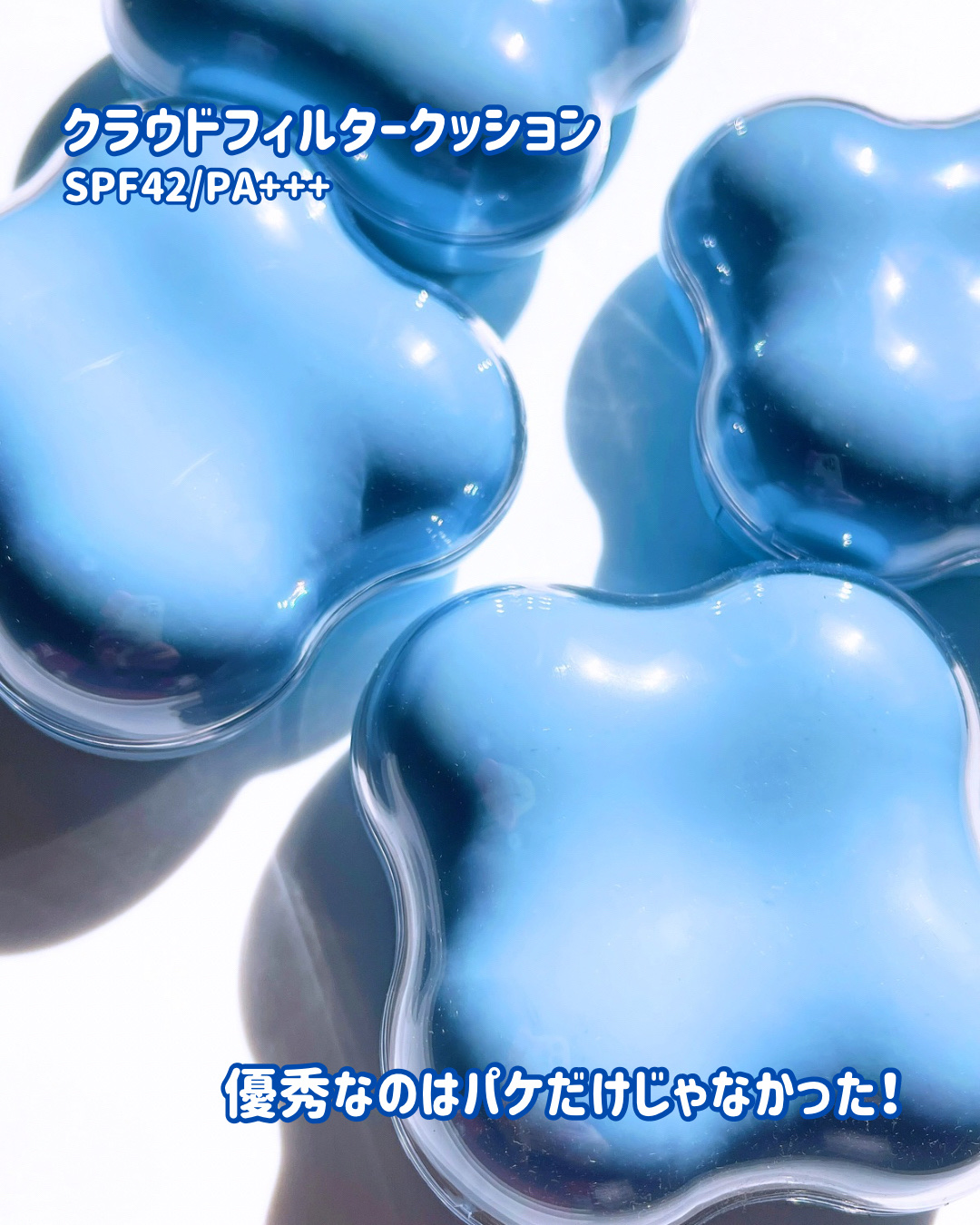 韓国アイドルのメイクを手掛ける人気へアメイクサロン「Kitts」との共同開発で誕生した”クラウドフィルタークッション”は、韓国現地では2月1日の発売直後に話題が沸騰し OLIVE YOUNG 販売ランキング1位を獲得する程大人気のクッションファンデーションです。 重たさを感じさせないサラッと軽やかな付け心地なのにコンシーラー要らずでニキビ跡や肌の色ムラをなめらかにカバーしてくれました😌 華やかな透明感溢れる肌へと仕上がります✨️ カラーは全4色展開で、ブルーパウダーが配合されているからかどのカラーを選んでも華やかさを感じられます☺️