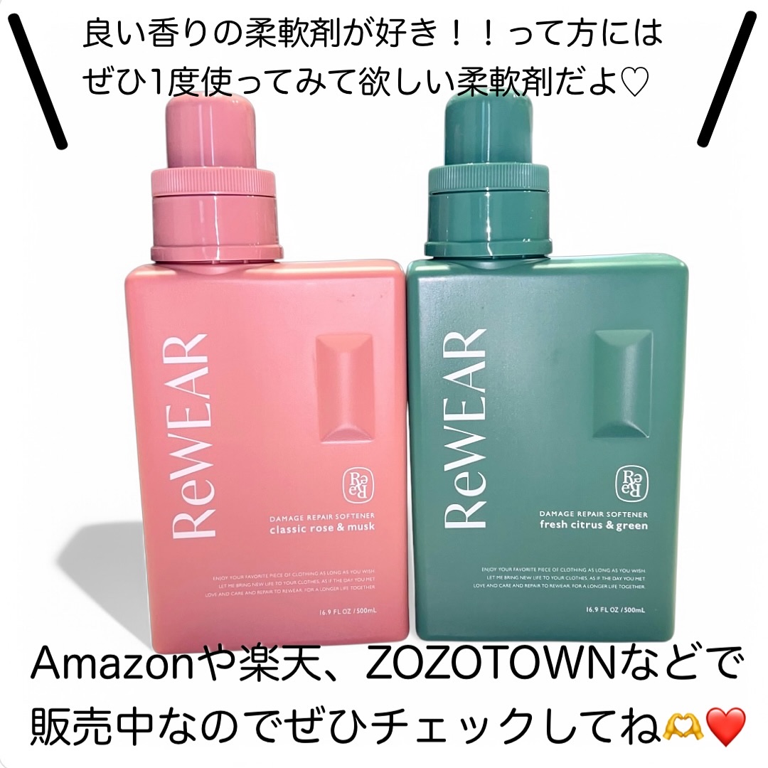 人気シャントリブランド「BOTANIST」の会社が手がける新柔軟剤ブランド『ReWEAR(リウェア)』 洗うたびに衣服をよみがえらせる※再生柔軟剤リウェアは、特徴成分であるセルラーゼ(酵素成分)のちからで毛羽立ちや毛玉を分解・除去し、色くすみも抑え、長く着続けるための衣類ケアができる柔軟剤です。 どちらも香りが良く、緑はすっきりした香り、ピンクは甘いムスクの香りがいい香り♡