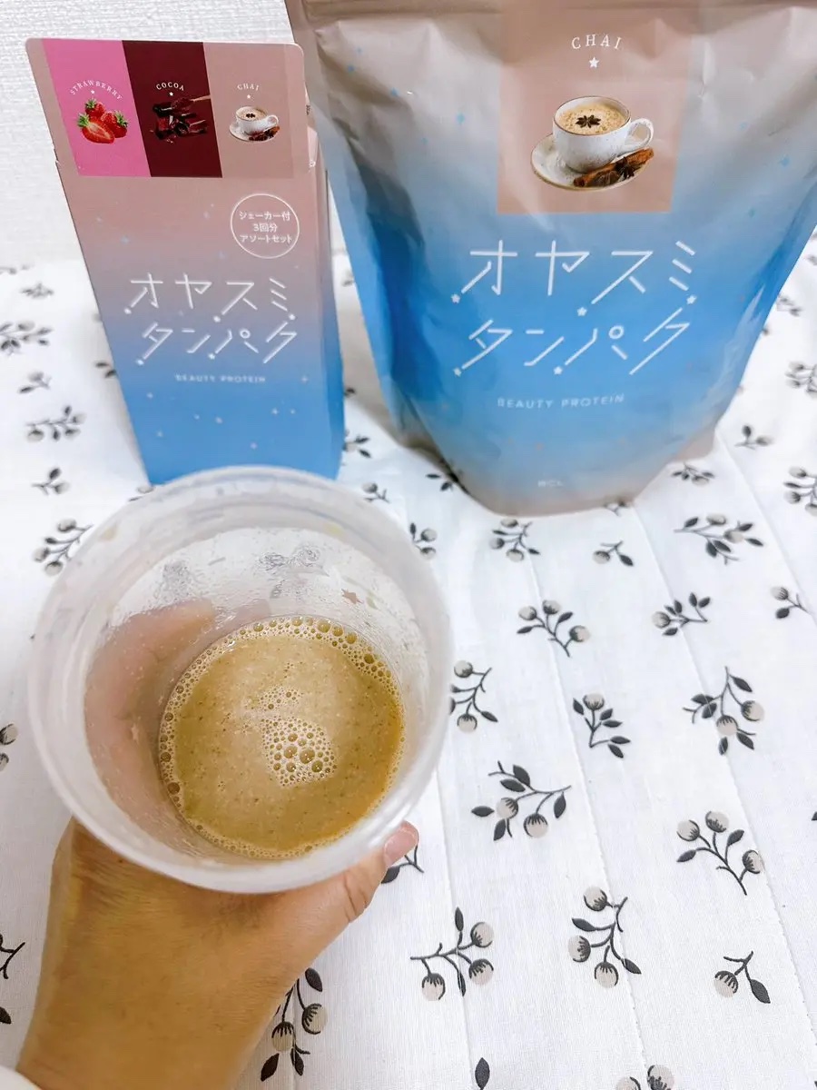 成長ホルモンの元となるアミノ酸をはじめ、栄養成分をバランス良く配合した夜の美容プロテイン、オヤスミタンパク。 イチゴ、ココア、チャイ味があるよ。水や牛乳に溶かして飲んでるけどどっちも美味しいよ! 可愛いシェイカーも大容量タイプもあるからチェックしてみてね