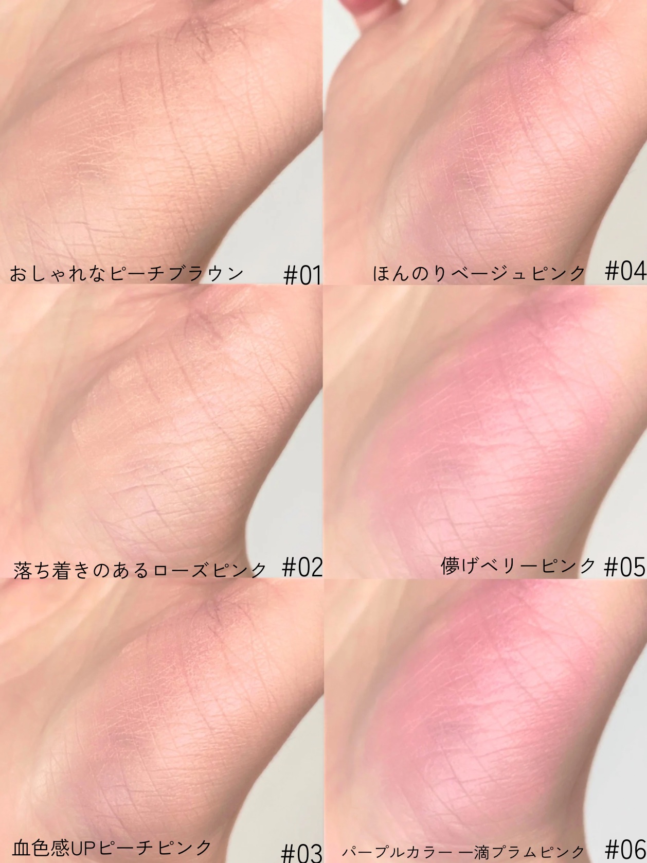 - 頬の内側からじゅわっと色付いたような自然でほのかな発色。 重ね塗りしてもムラになりにくく、サラッとした軽いテクスチャーが毛穴や凹凸をカバーし、なめらかな仕上がりに。 <POINT> 汗と皮脂を吸収するスライディングフィットパウダー配合で、時間が経ってもヨレを防いで付けたてのきれいな色味が持続。 01 大人な甘さのブラウンピーチ イエベ秋の方におすすめ 02 落ち着きのあるローズピンク イエベ、ブルべ問わずおすすめのカラー 03(日本限定色) 爽やかなピーチピンク イエベ、ブルべ問わずおすすめのカラー 04 ほんのりとした発色のベージュピンク イエベの方におすすめのカラー 05 活き活きとしたベリーピンク イエベ・ブルべ問わずおすすめのカラー 06 紫がかったプラムピンク ブルべの方におすすめのカラー