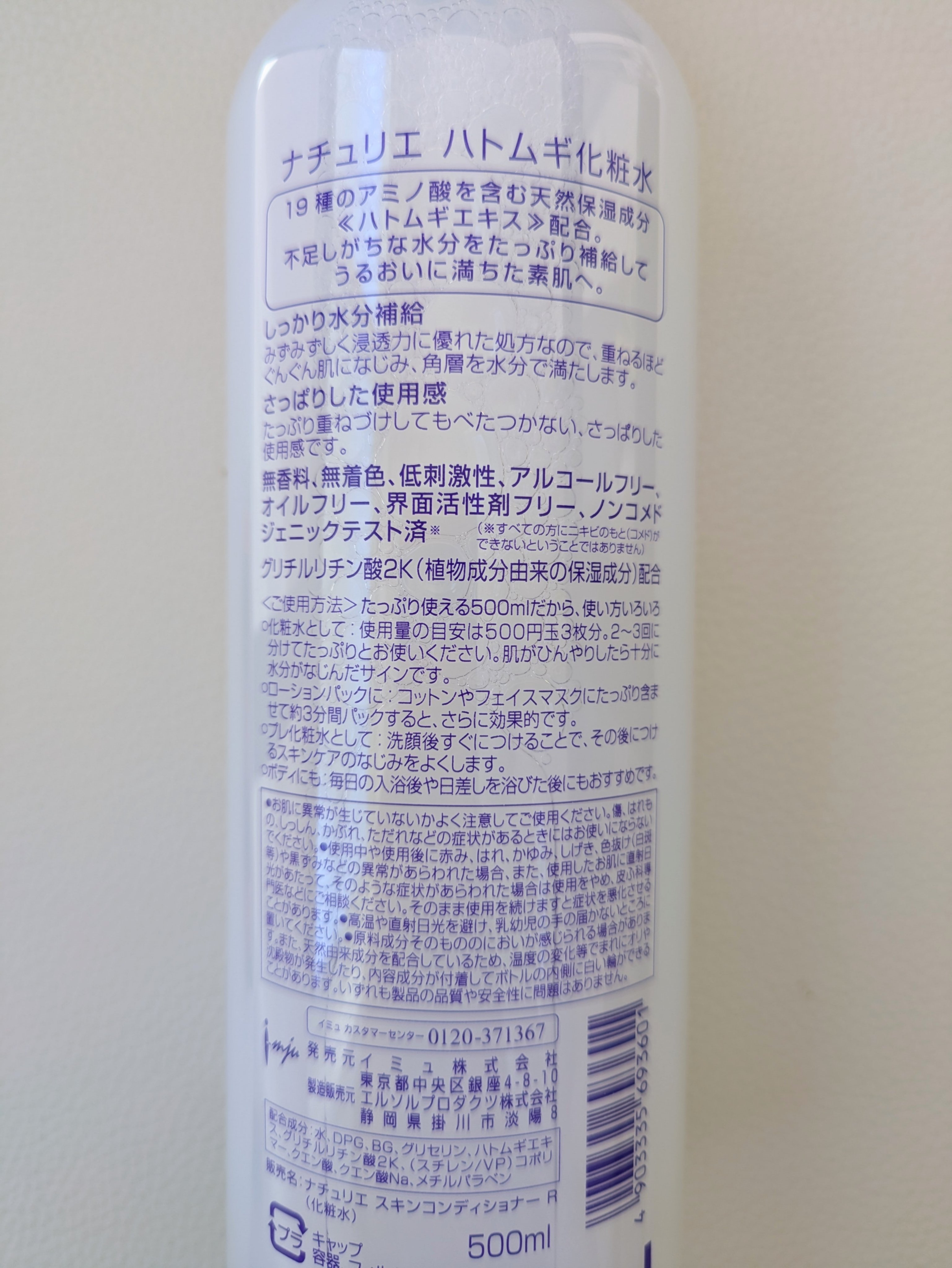 - <通常サイズ 500ml> 水、DPG、BG、グリセリン、ハトムギエキス、グリチルリチン酸2K、(スチレン/VP)コポリマー、クエン酸、クエン酸Na、メチルパラベン <500ml+ 限定ムーミンデザインボトル> 水、DPG、BG、グリセリン、ハトムギエキス、グリチルリチン酸2K、(スチレン/VP)コポリマー、クエン酸、クエン酸Na、メチルパラベン <詰め替えタイプ 480ml> 水、DPG、BG、グリセリン、ハトムギエキス、グリチルリチン酸2K、(スチレン/VP)コポリマー、クエン酸、クエン酸Na、メチルパラベン <旧製品> BG、グリセリン、メチルパラベン、エタノール、グリチルリチン酸2K、ハトムギエキス、DPG、クエン酸Na、プロピルパラベン、クエン酸、(スチレン/アクリレーツ)コポリマー、水 <限定ムーミンデザイン> 水、DPG、BG、グリセリン、ハトムギエキス、グリチルリチン酸2K、(スチレン/VP)コポリマー、クエン酸、クエン酸Na、メチルパラベン