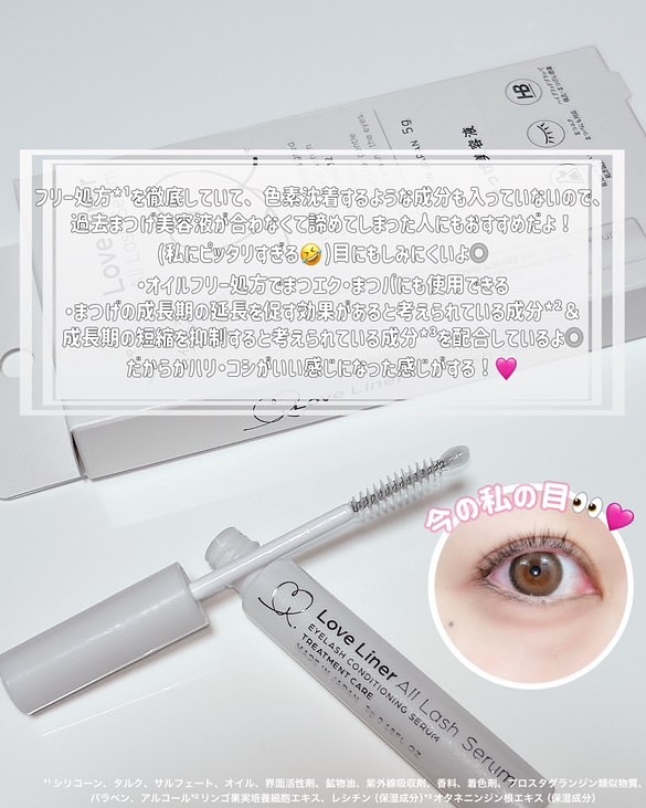 業界トップクラスのまつげエクステ・ラッシュリフト専門サロンを運営する「プロケアラボ社」との共同開発なのが特長🪄 36種もの美容液成分配合なのは、プチプラでもラブ・ライナーはトップクラスなのだそう👏🏻✨ フリー処方を徹底していて、色素沈着するような成分も入っていないので、過去まつげ美容液が合わなくて諦めてしまった人にもおすすめしたい🫶🏻