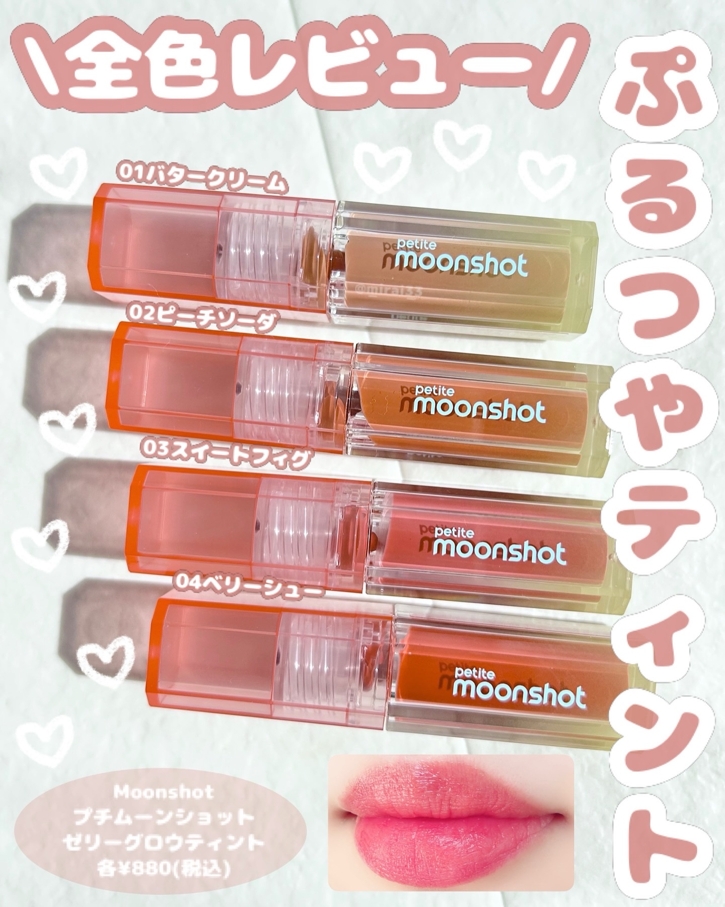 超コンパクトサイズで持ち運びやすいプチムーンショット💡 サイズ感がめちゃくちゃ可愛くてミニバッグの中にいれてもかさばらないよ👌❤️ ガラス玉みたいにちゅるんとした質感で、べたつかずにつやっとした仕上がり❤️ カラーの名前も可愛いよね🥰 日本Qoo10限定購入可能なのでメガ割でお得にGETしてね🫶✨