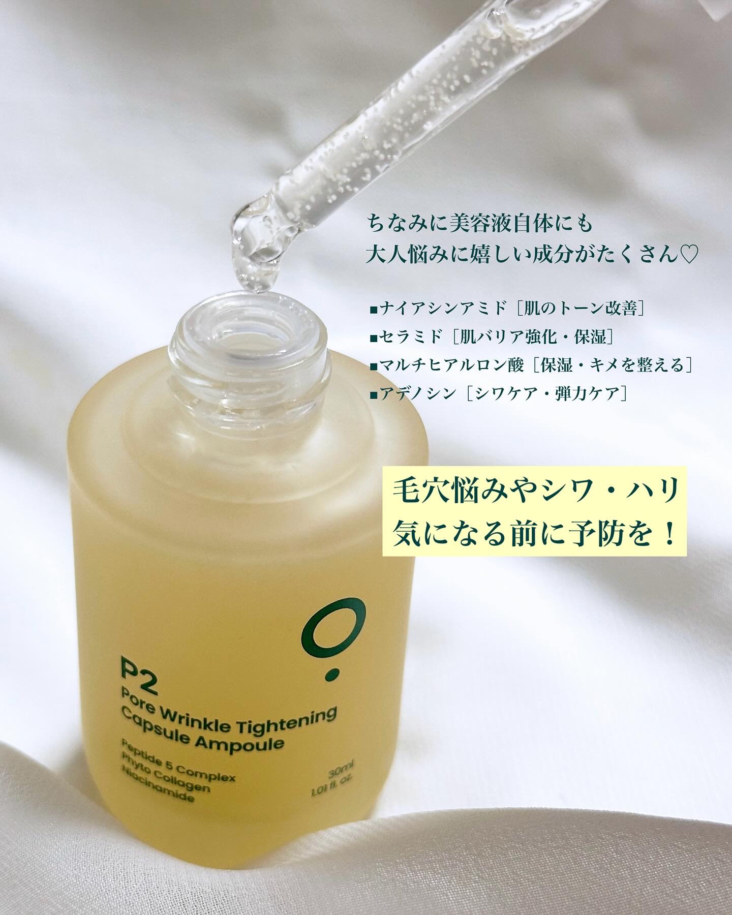 圧倒的な毛穴・シワ・ハリ改善効果! お肌のたるみを引き上げる P2毛穴シワタイトニング カプセルアンプル LUOKI独自のP2カプセル技術が反映された驚きの肌の弾性復元力 毛穴!シワ!たるみに効果が期待できる美容液なんて、私の悩みにピッタリ!最高すぎない!? ボトルはスポイト式なので量の調節もしやすいし清潔に使えるのが嬉しいですね。