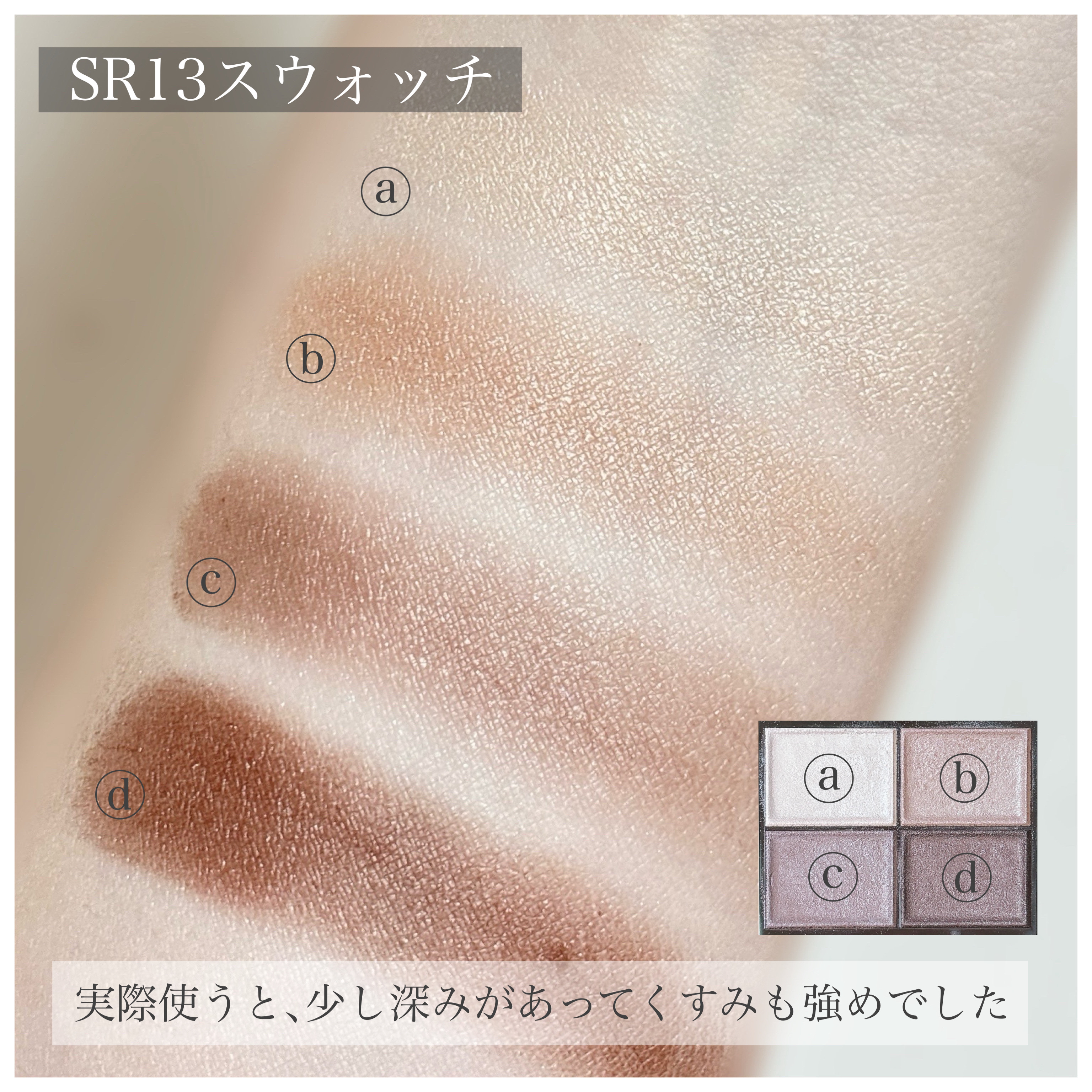 - 【ポイント】 1.失敗しらずのブラウンベースの4色パレット!簡単にグラデーションを実現。 2.しっとりリッチな質感!するする伸びて粉飛びもなく目元の乾燥も防ぎます。 3.上品な輝きの繊維パール+金パールを贅沢に配合。ギラつかない大人のツヤを演出。 <SR01'23・SR03'23・SR06'23・SR11'23(限定デザイン)> 実力派グラデアイシャドウからデジタルアートをあしらった限定デザイン登場。 しっとりリッチな密着感。肌のなじみの良い実力派グラデアイシャドウ。