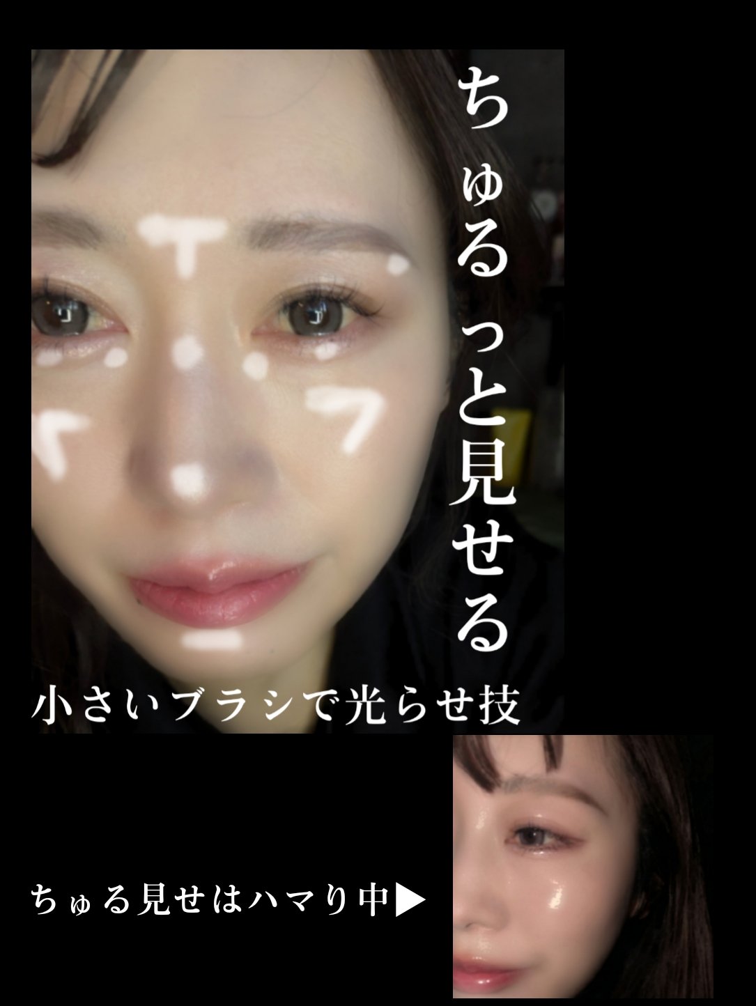 ちゅるっと見せが今のおすすめかな? ちゅるっとさせるには細いブラシがおすすめ❤ あーメイクって詐欺れるから楽しい。 盛れなかった日ももちろんあるけど盛れると1日楽しくなれる。 ハイライト、チーク、シェード、一体どこに何を入れれば盛れるの?!!って迷走中の皆さんに。