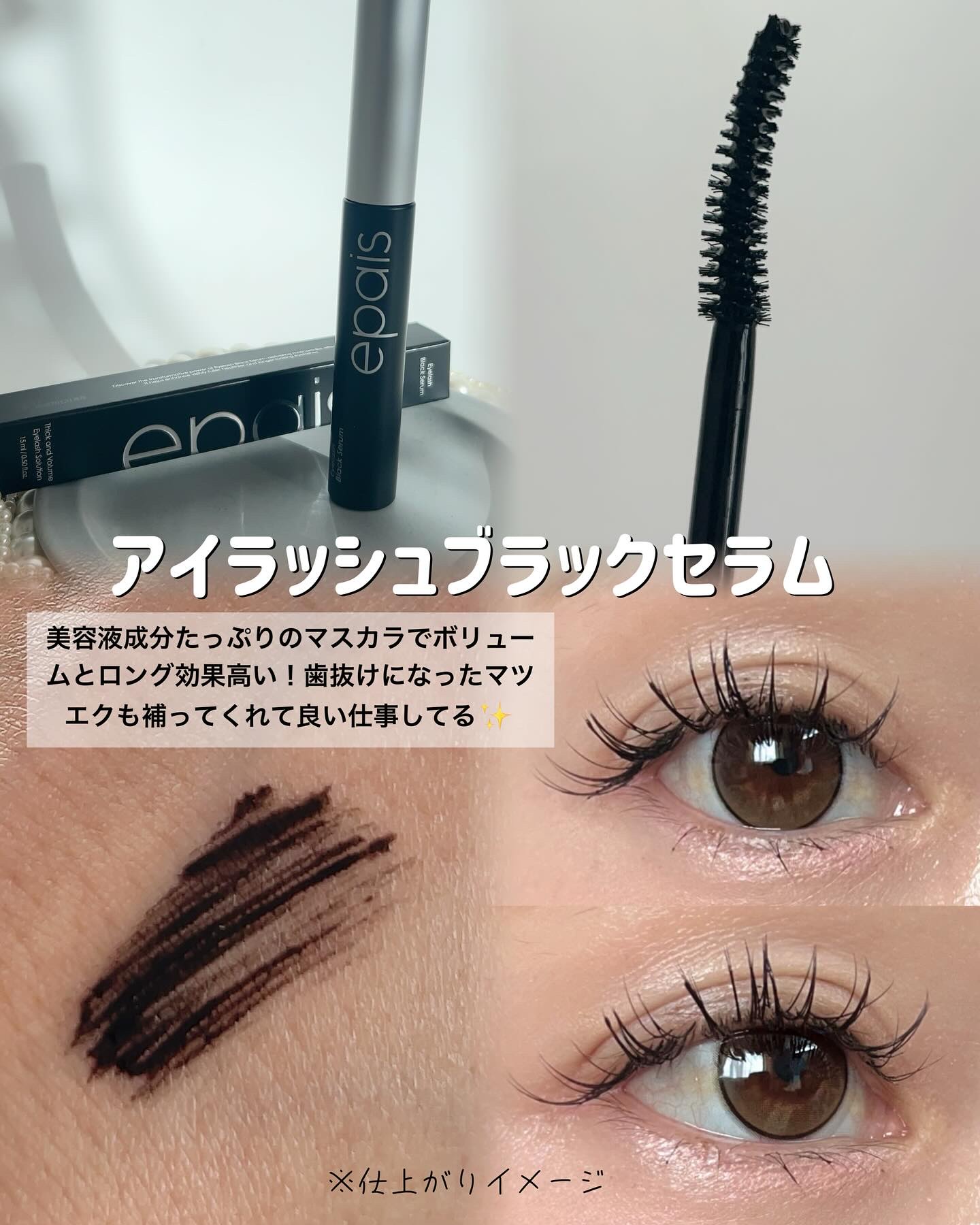 10個の特許成分で高濃縮栄養ケア ✔︎低刺激処方で目が染みることなく使用できる ✔︎まつげだけでなく、眉毛やヘアラインにも使用可能 100%自然由来発色で目への負担✕ ✔︎栄養たっぷりブラックジェルエッセンス ✔︎ぬるま湯で落とせる アイラッシュブラックセラムは、本当にまつげ美容液か疑うほどロング・ボリューム感ともに天才でした🥹 お湯で落とせるのも本当に嬉しい