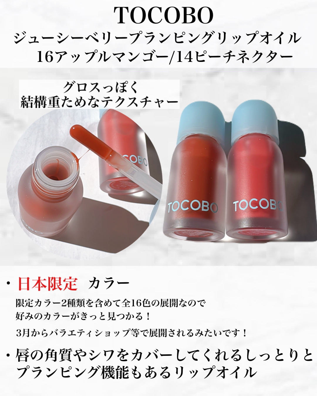 塗って寝るだけ、朝のリップが変わる。 トコボの2STEPケアで、角質のないふっくらツヤリップへ。 夜はオーバーナイトリップマスクで唇を整え、朝はプランピングリップオイルでシワをカバーしながらボリューム感のある仕上がりに。 日本限定カラーを含む全16色のリップオイルで、自分カラーで最高のうる艶リップになれる!