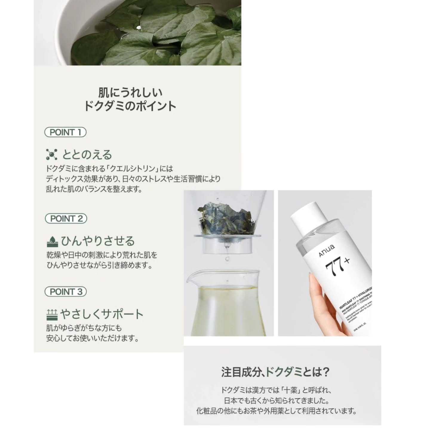 こちらの商品は、こだわった自然由来成分のドクダミエキスを肌に最も適切な比率の77%でたっぷり詰め込み、肌にピタッと密着してバランスを整えてくれるという特徴のある化粧水になります✨ 手に取ると、軽やかなとろみ感のあるテクスチャー! みずみずしく、すっとお肌になじむような付け心地です😌 ベタつかず、さっぱりとした使用感がとても使いやすいです👍 コットンにとり、ふき取りやパックとして使用しても◎