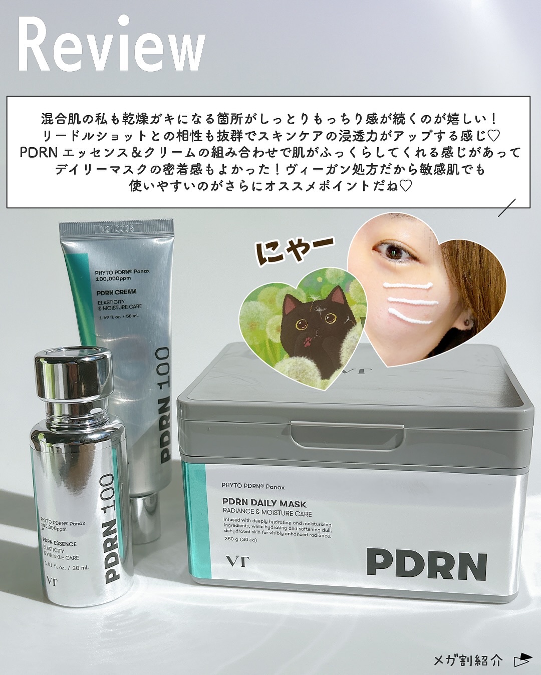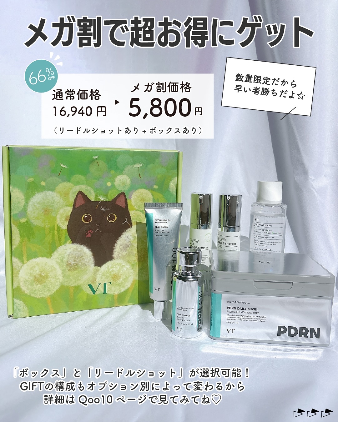 コラボパッケージがかわいい😻 VTから2024年から大人気の美容成分【PDRN】のアイテムが入ったお得なセットが登場✦ リードルショット300は夜のスキンケアでPDRNと一緒に使ってもちもちな肌に✦ リードルショット50は日中にも使えるし、針が初めての人にも使いやすいチクチク感だと思ってる🔰ˊ˗ 肌悩みニャンでも解決PDRNセットで乾燥しない肌を目指しましょー🌟 Qoo10のメガ割でお得に購入できます😻˒˒*
