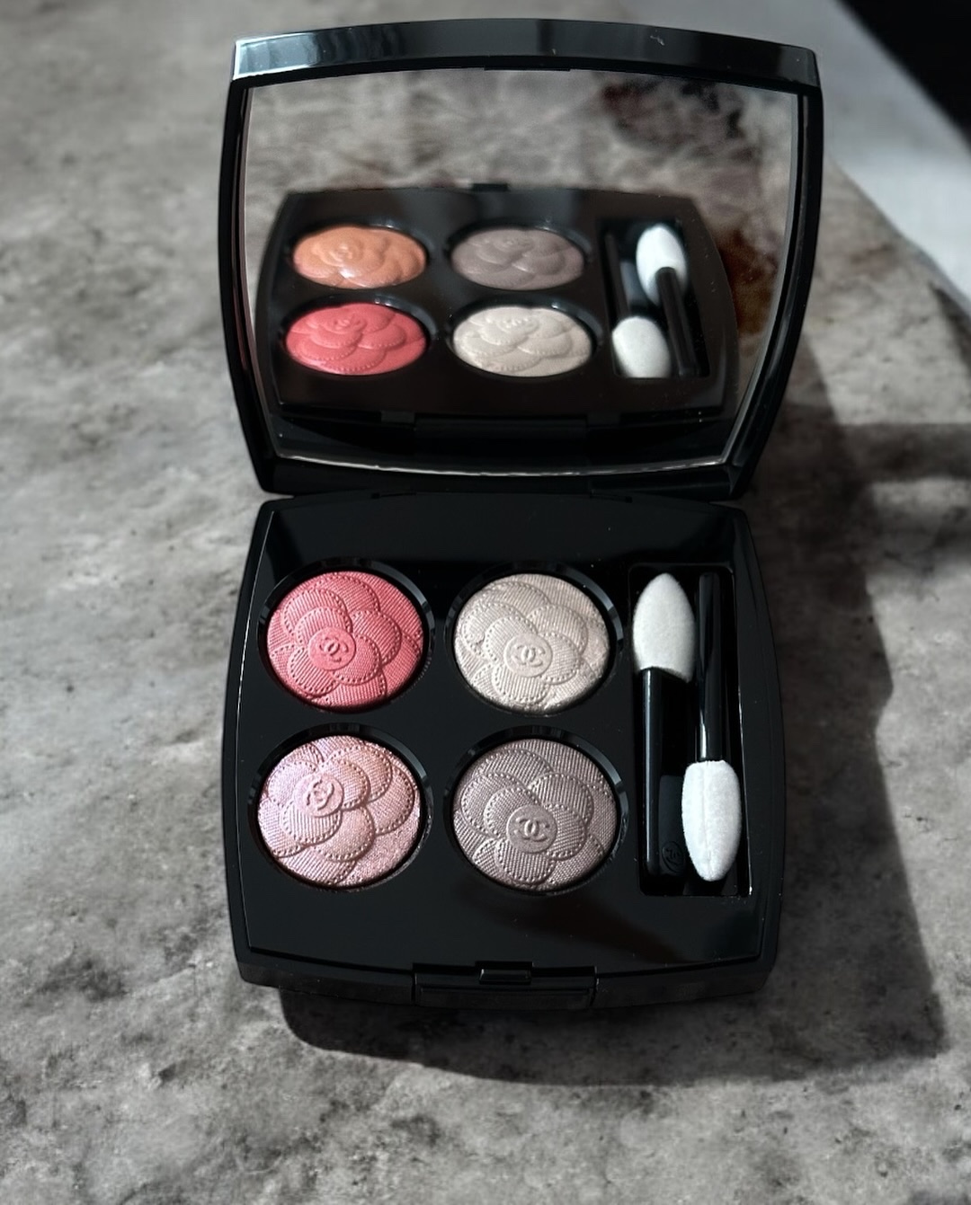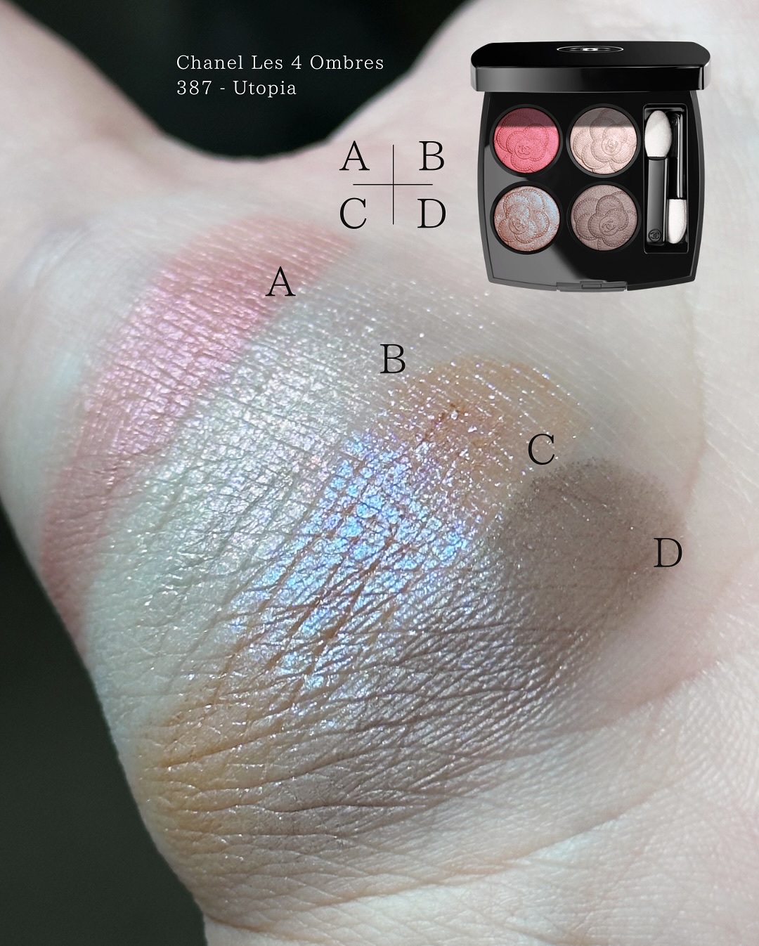 カメリアモチーフの春コスメ🌸 #レキャトルオンブル387 #ユートピア 9,900円<特別限定品> 高級感すごい😍 左上:サテン ピンク 左下:ブルーとパープル ピンクのデュオクローム 右上:ピンクがきらめくホワイト ハイライト 右下:サテン トープ 発色は柔らかいので、使い方次第で幅広いシーンで使えると思います。何とも絶妙なカラー🤍
