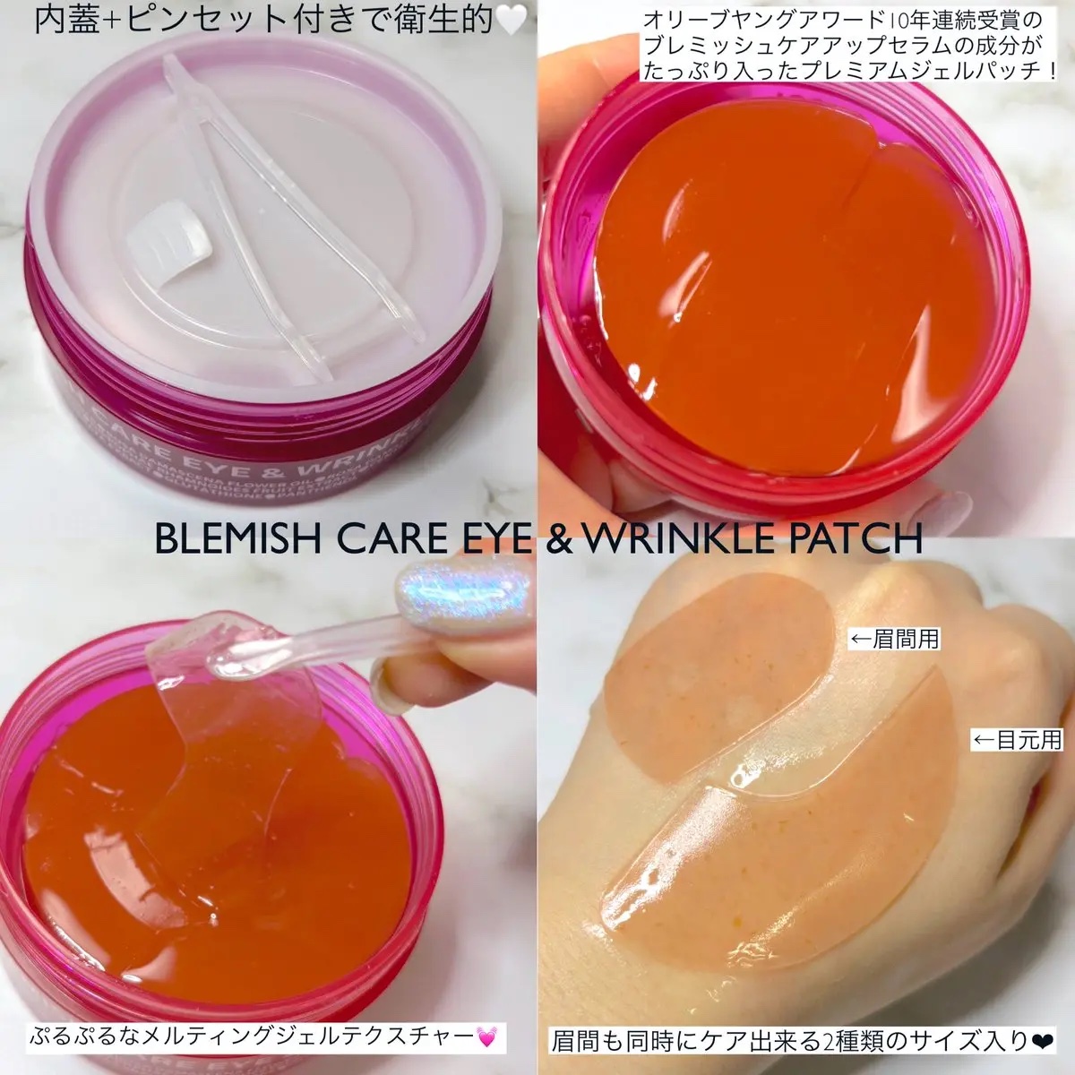 1日3分の簡単ケア❣️ 2種類のサイズが入っており、目元と眉間、同時にケアが可能なのも嬉しい。 オリーブヤングアワード10年連続受賞の、ブレミッシュケアアップセラムの成分がたっぷり入った、プレミアムジェルパッチ。 たっぷりの液でぷるぷるのジェルパッチは、肌にのせて吸収されるほど密着して、とっても気持ちが良くて、お肌がしっとり。