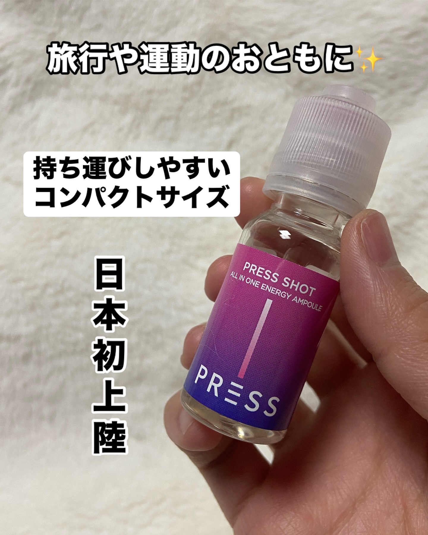 - ・PRESSしてSHAKEするだけ!魔法のようなピンクビタミンに! ・飲むインナービューティー ・飲むピンクビタミン ・粉末にはビタミン B12/D/E、葉酸、ナイアシン、亜鉛が含まれています ・吸収力を重視した液状タイプでの商品設計 ・特許取得の特殊キャップにビタミンを真空密封 ・ビタミンB群を集中配合 ・ビタミンB12は1日の基準値に対し16,667%配合 ・液体は11種類のアミノ酸で吸収しやすい設計 ・飲む瞬間にキャップを押す⇒ビタミンが液体に混ざりフレッシュなビタミンドリンクが完成! 【注意事項】 ・高カルシウム血症がある場合、または医薬品を服用されている方は専門家に相談してください。 ・体に異変を感じた場合は使用を中止し、速やかに専門家に相談してください。 ●本品は、多量摂取により疾病が治癒したり、より健康が増進するものではありません。 亜鉛の摂り過ぎは、銅の吸収を阻害するおそれがありますので、過剰摂取にならないよう注意してください。一日の摂取目安量を守ってください。乳幼児・小児は本品の摂取を避けてください。 ●本品は、特定保健用食品と異なり、消費者庁長官による個別審査を受けたものではありません。 ●食生活は、主食、主菜、副菜を基本に、食事のバランスを。 ●本品製造工場では卵、小麦、そば、落花生、えび、かに、くるみを含む製品を製造しています。 ●摂取目安量:1日当たり1本を目安にお飲みください。 ●摂取の方法:キャップを押すと粉末が落ちます。上下に振り、混ぜてからお飲みください。※粉末が固まる場合がございますが、品質には問題ありません。よく振ってからお飲みください。 2024年12月中旬より全国のウエルシア薬局とロフト※にて先行販売をいたします。 ※一部お取り扱いがない店舗がございます。