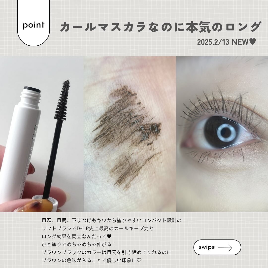 カールキープ力が高いのに、しっかりとまつげの長さも出せるのが特徴のD-UP ハイパーリフトマスカラに、本日2月13日から新色として「ブラウンブラック」が仲間入り。 黒ほど強くならず、それでいて目元をしっかり引き締めてくれる「ブラウンブラック」。ナチュラルメイク派はもちろん、抜け感のある目元を作りたい人にもおすすめな色味。 ウォータープルーフでありながらクレンジングオイルで簡単に落とせるのもうれしいポイント。オフの手間がかからないのは魅力です✨