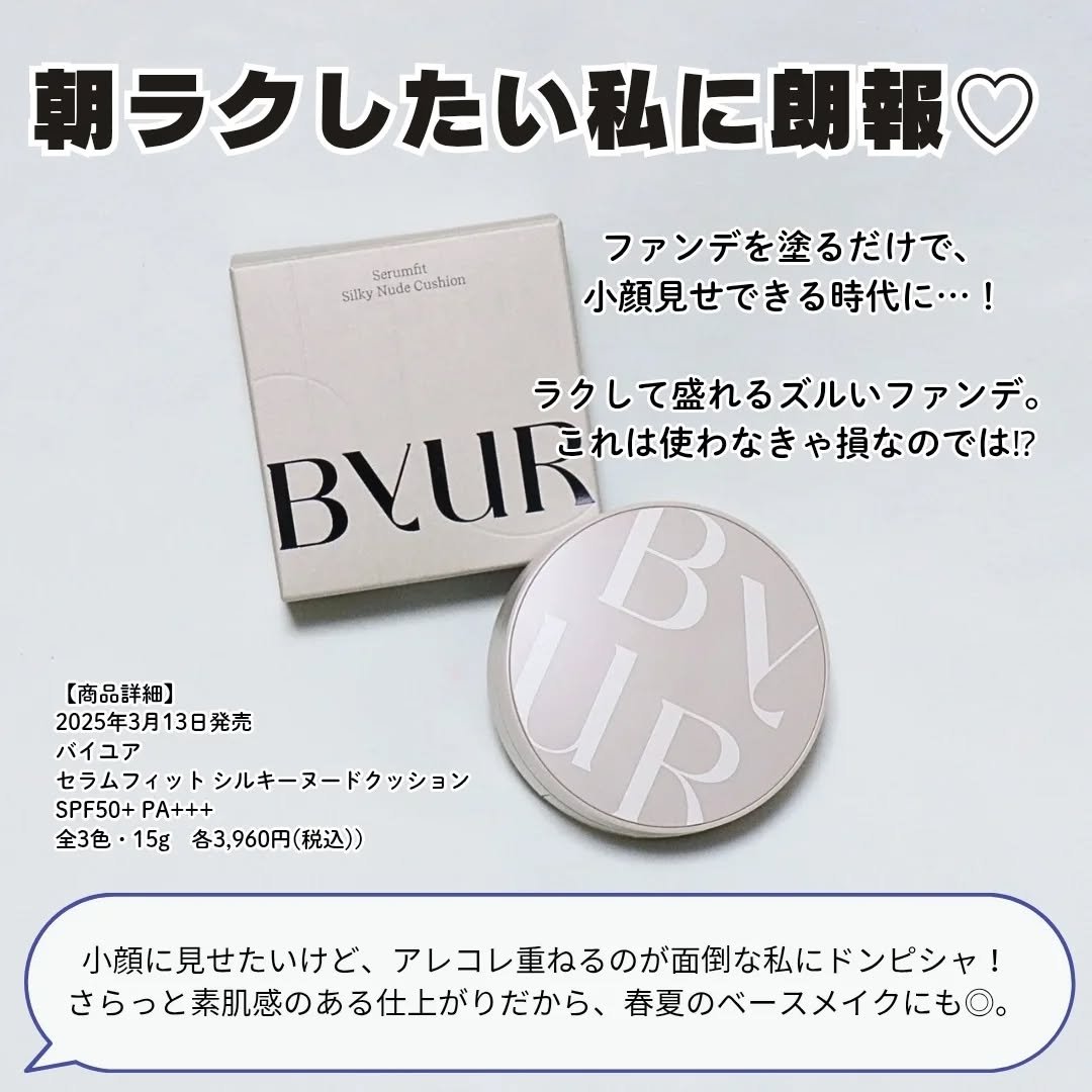 - SPF50+・PA+++ ひと塗りで骨格の自然な陰影を強調し、シェーディングいらずで立体感あふれる印象を引き出す新感覚クッションファンデーション。 素肌のように自然なツヤがあるシルキーヌードな質感で、メリハリのある洗練された印象を引き出します。 バイユア独自の視点で選んだ、シロキクラゲエキスなど「毛穴管理」のためのさまざまな美容成分を贅沢に配合。 纏っている間中毛穴ケアができるから、使うたび、素肌からうるおってなめらかに。 2月27日公式オンラインストア・一部バラエティショップ先行発売 ※ 2025 年 2 月 6 日より公式オンラインストア予約開始