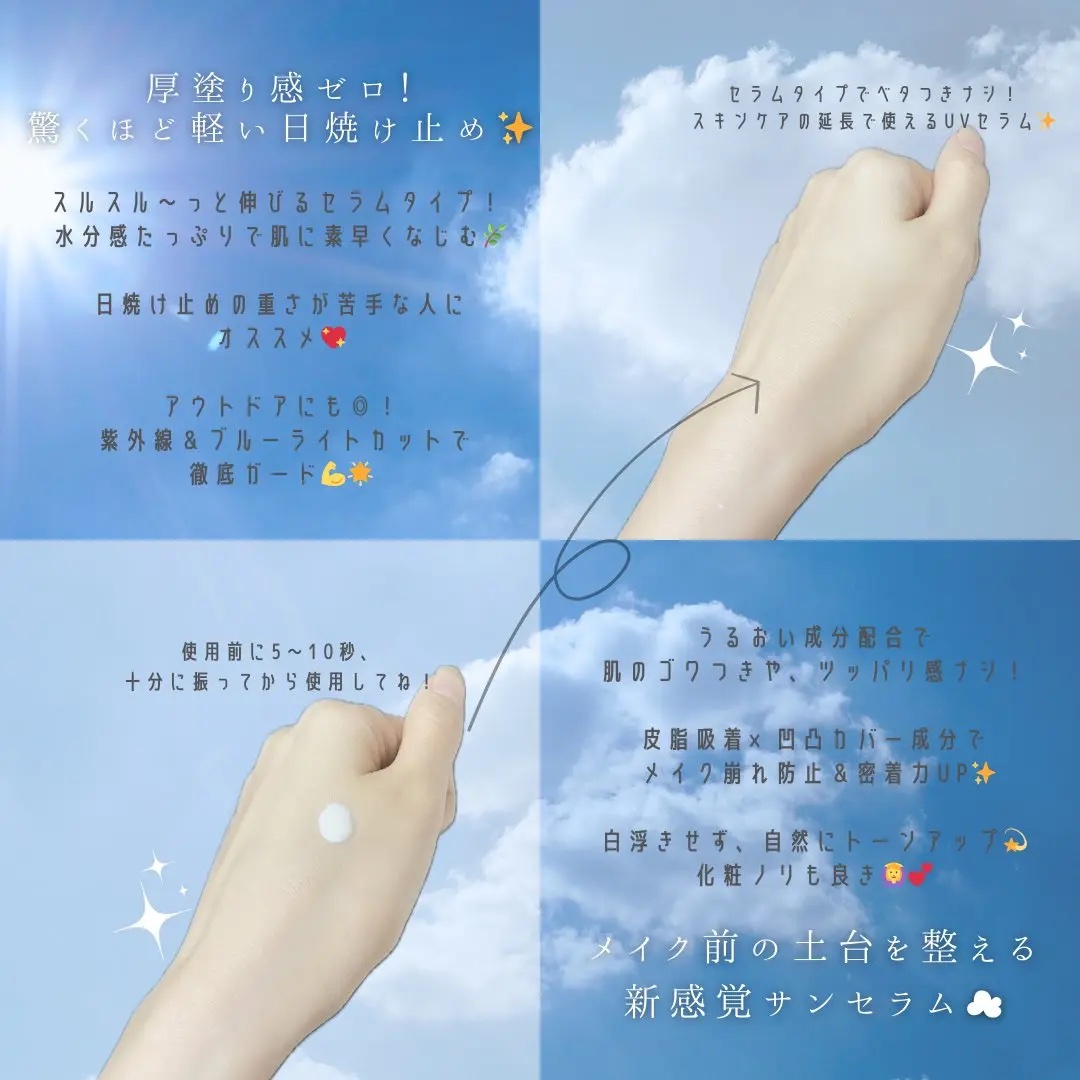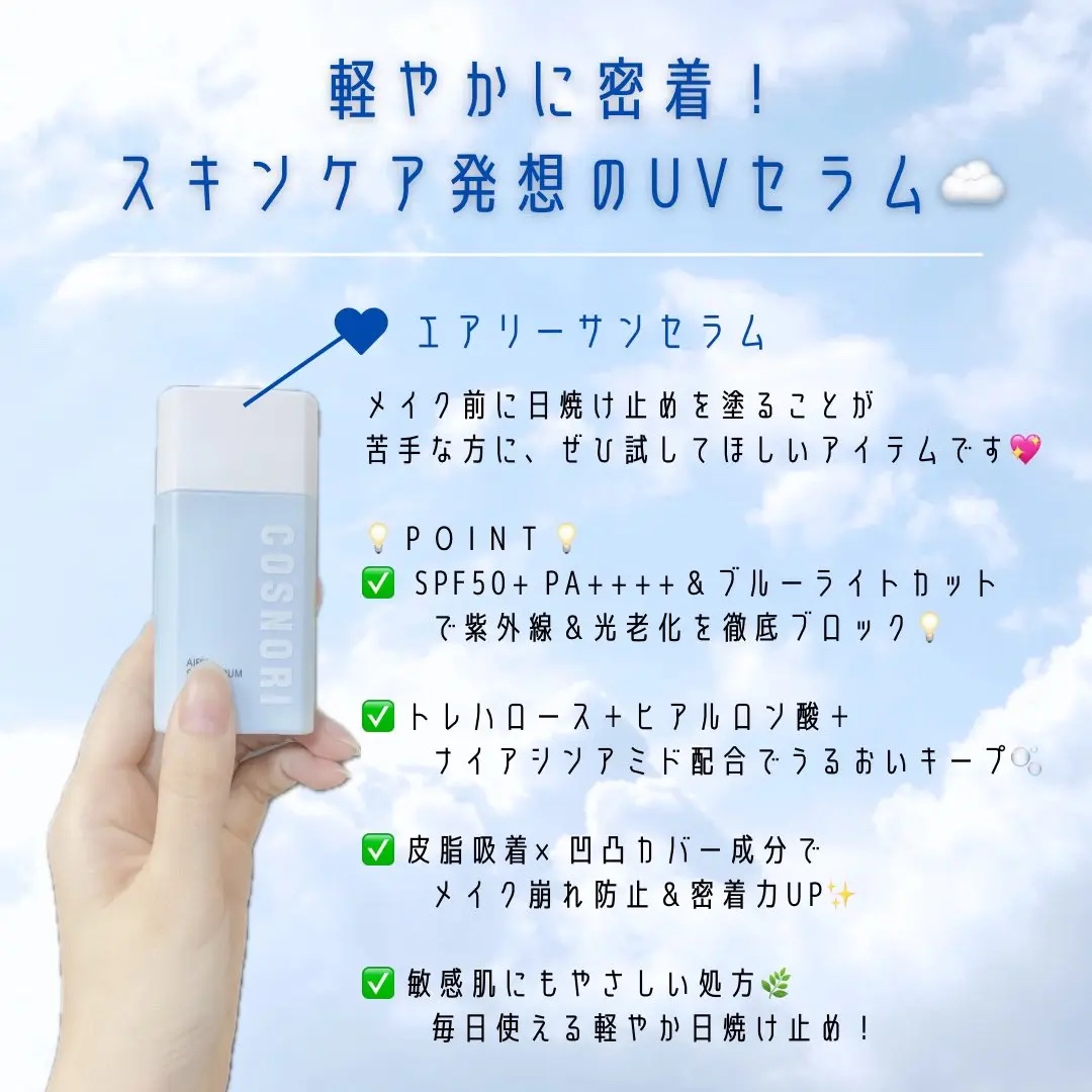 COSNORIから新作の日焼け止めが登場しました!雲のように軽いサンセラムです。 日焼け止め特有のツッパリ・ゴワゴワ感、重さはまったくなくて使いやすい✨ SPF50+、PA++++でしっかり紫外線遮断できます。
