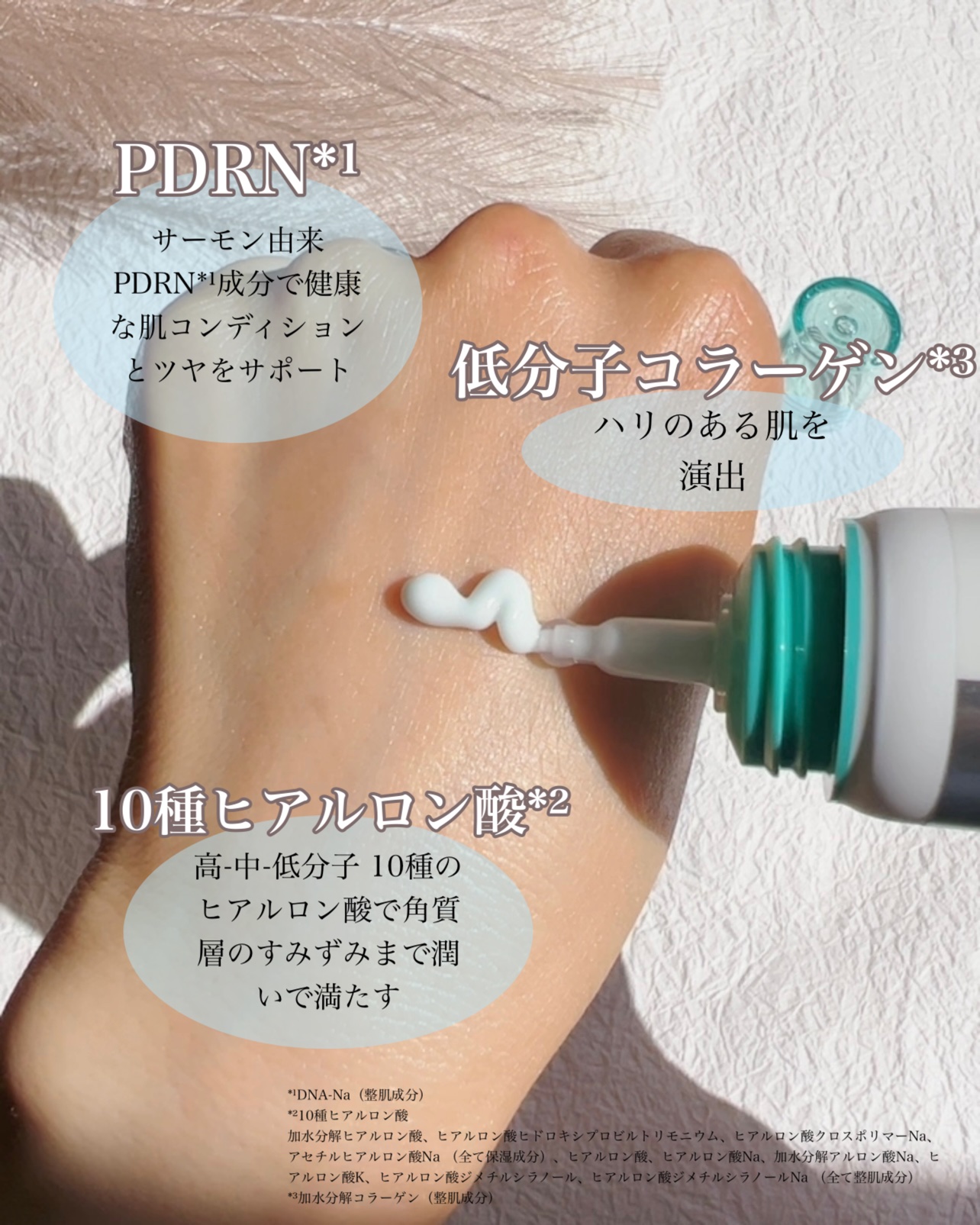 - <PDRNヒアルロン酸100 モイスチャライジングクリーム> 水、スクワラン、グリセリン、ナイアシンアミド、ペンチレングリコール、1,2-ヘキサンジオール、ジフェニルシロキシフェニルトリメチコン、PCAジメチコン、BG、プロパンジオール、(アクリロイルジメチルタウリンアンモニウム/VP)コポリマー、ベヘニルアルコール、ジグリセリン、(C14-22) アルコール、(アクリル酸ヒドロキシエチル/アクリロイルジメチルタウリンNa)コポリマー、(アクリレーツ/アクリル酸アルキル(C10-30))クロスポリマー、(C12-20)アルキルグルコシド、加水分解コラーゲン、メチルプロパンジオール、DNA-Na、ヒアルロン酸Na、エチルヘキシルグリセリン、メリアアザジラクタ葉エキス、アデノシン、加水分解ヒアルロン酸、メリアアザジラクタ花エキス、フィチン酸Na、コクシニアインディカ果実エキス、AMP D、カルボマー、ヒアルロン酸、(メチルビニルエーテル/マレイン酸)コポリマー、アロエベラ花エキス、ナス果実エキス、カミメボウキ葉エキス、マデカッソシド、サンゴモエキス、ウコン根エキス、(C12, 13) パレスー9、ヒアルロン酸ジメチルシラノール、加水分解アルロン酸Na、アシアチコシド、ヒアルロン酸K、ヒアルロン酸ヒドロキシプロピルトリモニウム、ヒアルロン酸クロスポリマーNa、ツボクサエキス、ヒアルロン酸ジメチルシラノールNa、アセチルヒアルロン酸Na