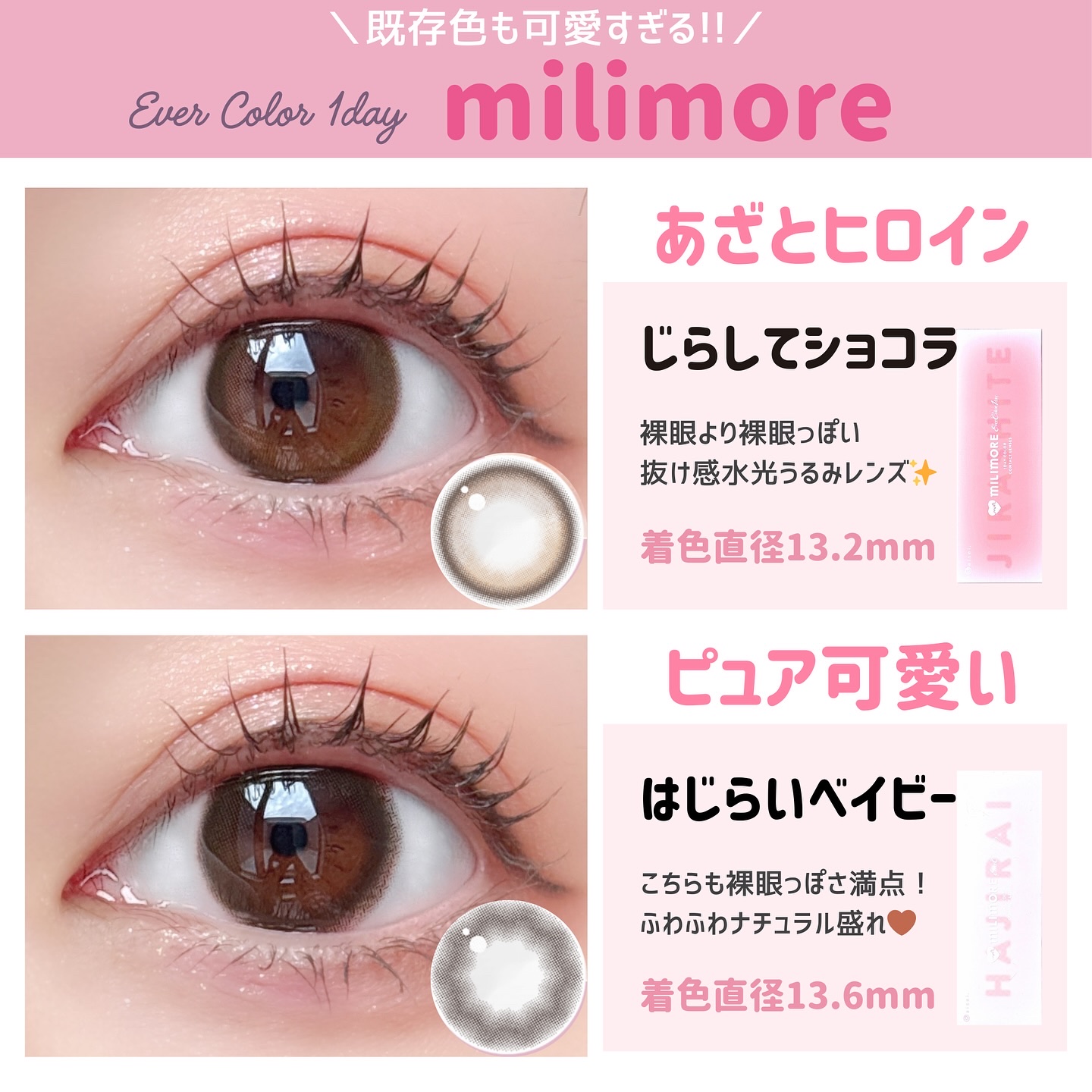小さくても盛れる⟡.·ミリモア全8色レビュー💎🩶⟡エバーカラーワンデーミリモア全8色/各¥1,694(税込)▫️𝗟𝗘𝗡𝗦𝗦𝗣𝗘𝗖DIA:14.2mmG.DIA:13.1mm~13.6mmBC:8.7mm度数:±0.00~-8.00含水率:60...