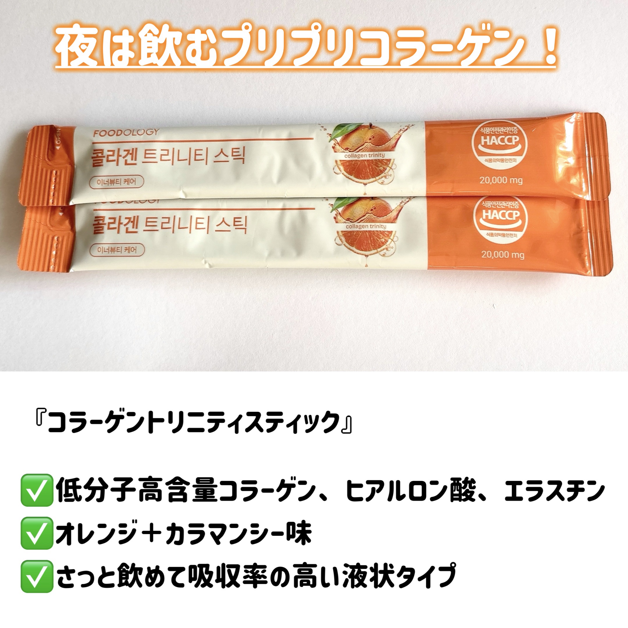 【FOODOLOGYコラーゲントリニティスティック/コラーゲンセンテラゼリー/コレオロジーカットゼリー】ダイエットで有名なフードオロジーから肌ケアの新商品が発売!コラーゲントリニティスティックはオレンジジュースみたいで、コラーゲンセンテラ(シ...