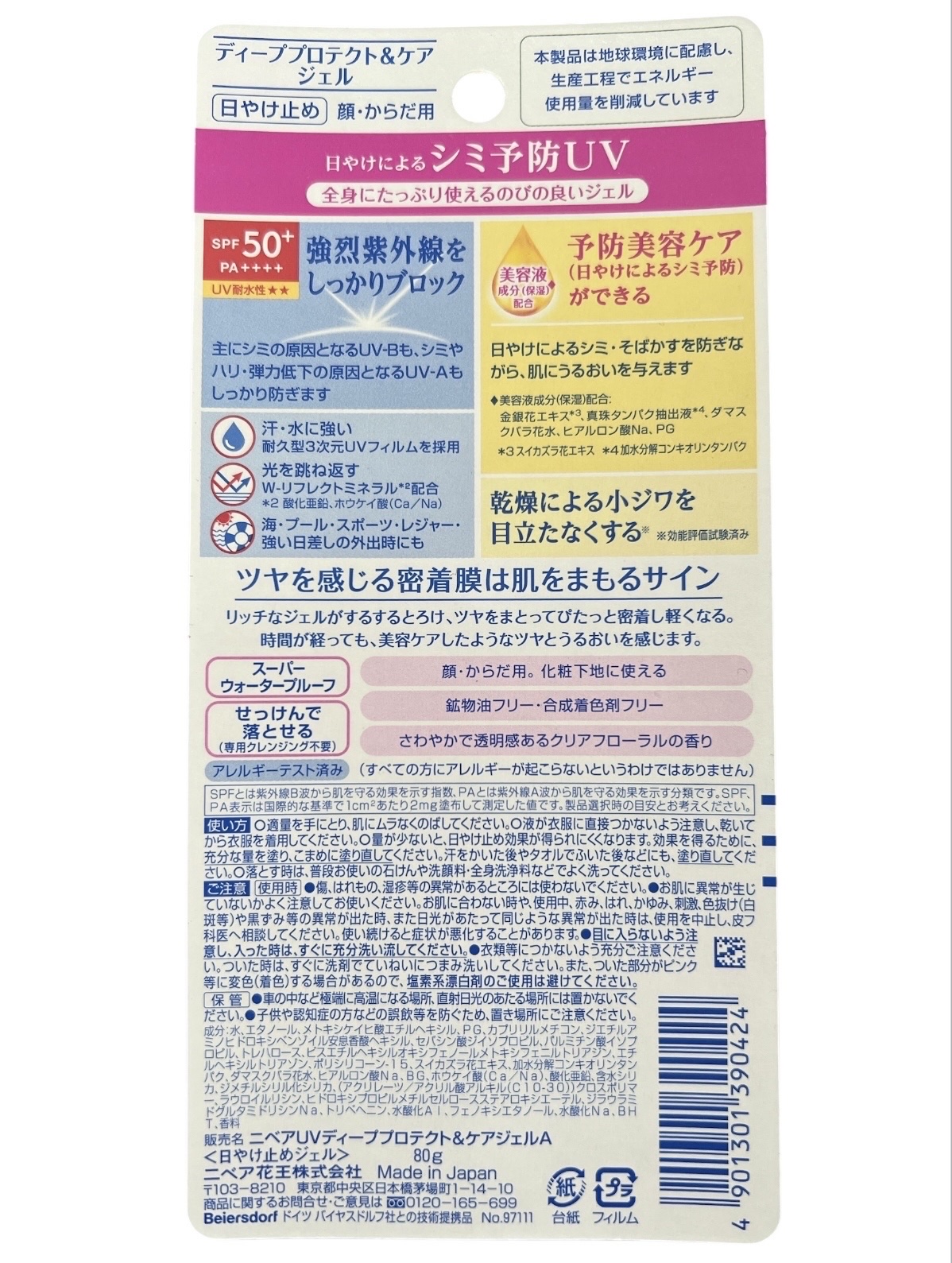 - ãDEEP PROTECTã ã»SPF50+/PA++++ãUVèæ°Žæ§â â ã»ããã¢æåŒ·(*6)ã·ãªãŒãº (*6) ããã¢UVã·ãªãŒãºå ã«ããããUVã«ãã广ïŒSPF50+ïŒPA++++ïŒããã³æ¥æ°Žå¹æã«ãã㊠ã»äž»ã«ã·ãã®åå ãšãªãUV-Bããã·ããããªã»åŒŸåã®äœäžã®åå ãšãªãUV-Aããã£ããé²ããŸãã ã»ã¹ãŒããŒãŠã©ãŒã¿ãŒãã«ãŒã ãCareã ã»äºé²çŸå®¹ã±ã¢ïŒæ¥ããã«ããã·ãäºé²ïŒãã§ãã ã»æ¥ããã«ããã·ãã»ãã°ãããé²ããªãããèã«ãããããäžããŸãã ã»çŸå®¹æ¶²æåïŒä¿æ¹¿ïŒé åïŒãžã§ã« ïŒééè±ãšãã¹ïŒã¹ã€ã«ãºã©è±ãšãã¹ïŒãçç ã¿ã³ãã¯æœåºæ¶²ïŒå æ°Žåè§£ã³ã³ããªãªã³ã¿ã³ãã¯ïŒãããã¹ã¯ãã©è±æ°Žããã¢ã«ãã³é žNaãPG