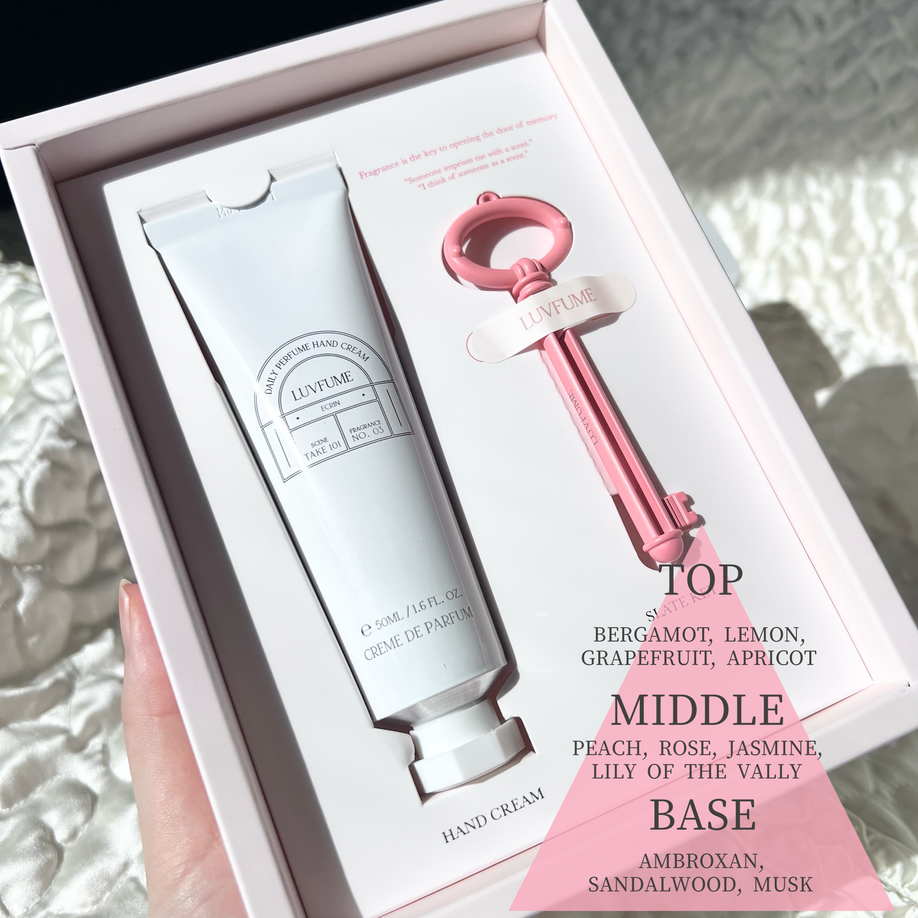 “香りは記憶の扉を開く鍵”をコンセプトに、感覚的な香りと、高級感のある美しいパッケージも魅力のハンドクリーム。 ウッドベースに、ジューシーな桃の甘さが広がるみずみずしくフレッシュなフルーティフローラルの香り。 開いた瞬間にときめくギフトBOXは、シグネチャーアイテムのスレートキー付き🗝