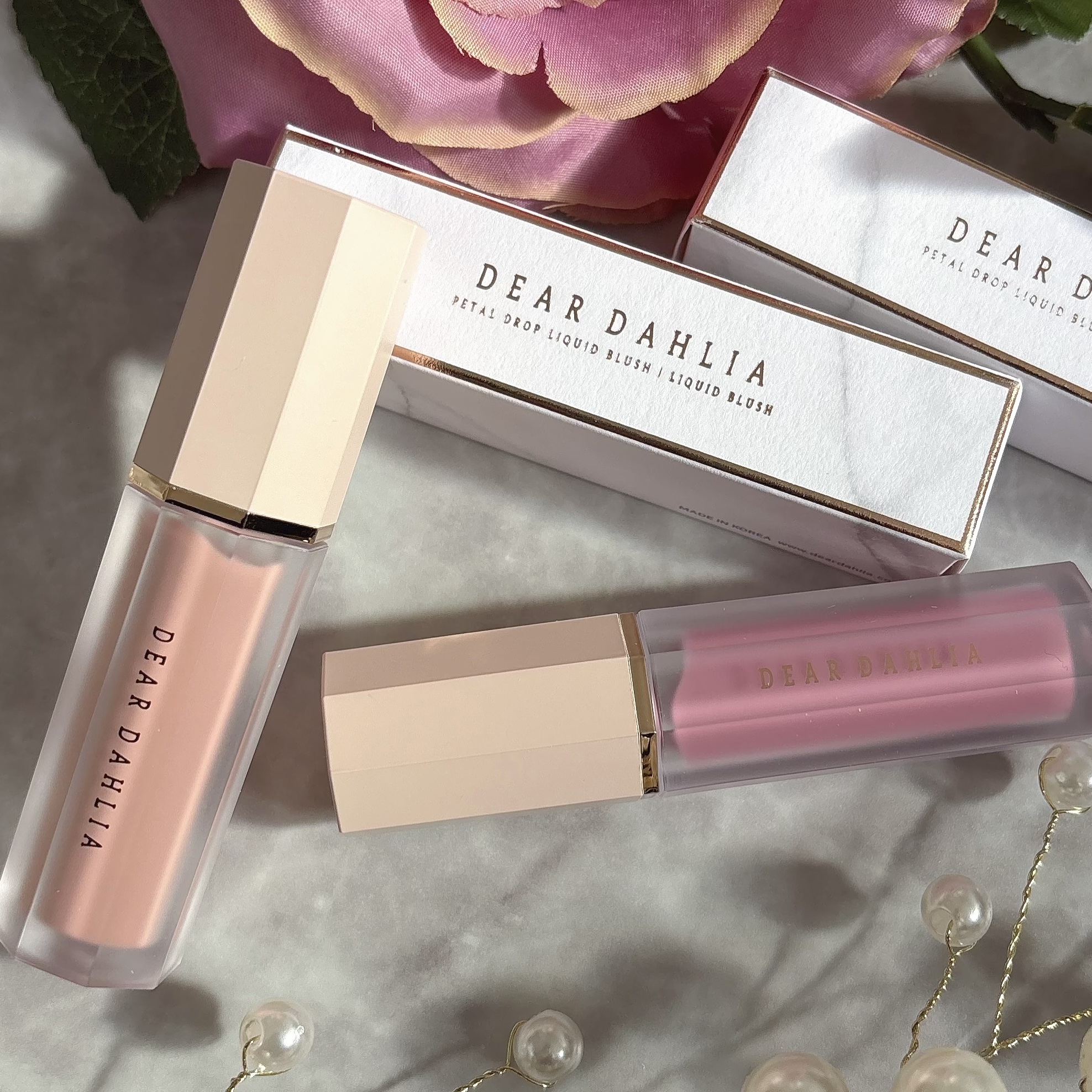 ディアダリアのコスメのパケもキラキラで大人かわいい🌹 DEAR DAHLIA ディアダリアのペタルドロップリキッドブラッシャー 3色レビューした🤗 じゅわっと湯上がりメイクができる😍 そのままブラシを使ってもいいし、指でトントンと伸ばしてもいい! リキッドチークでツヤツヤ✨