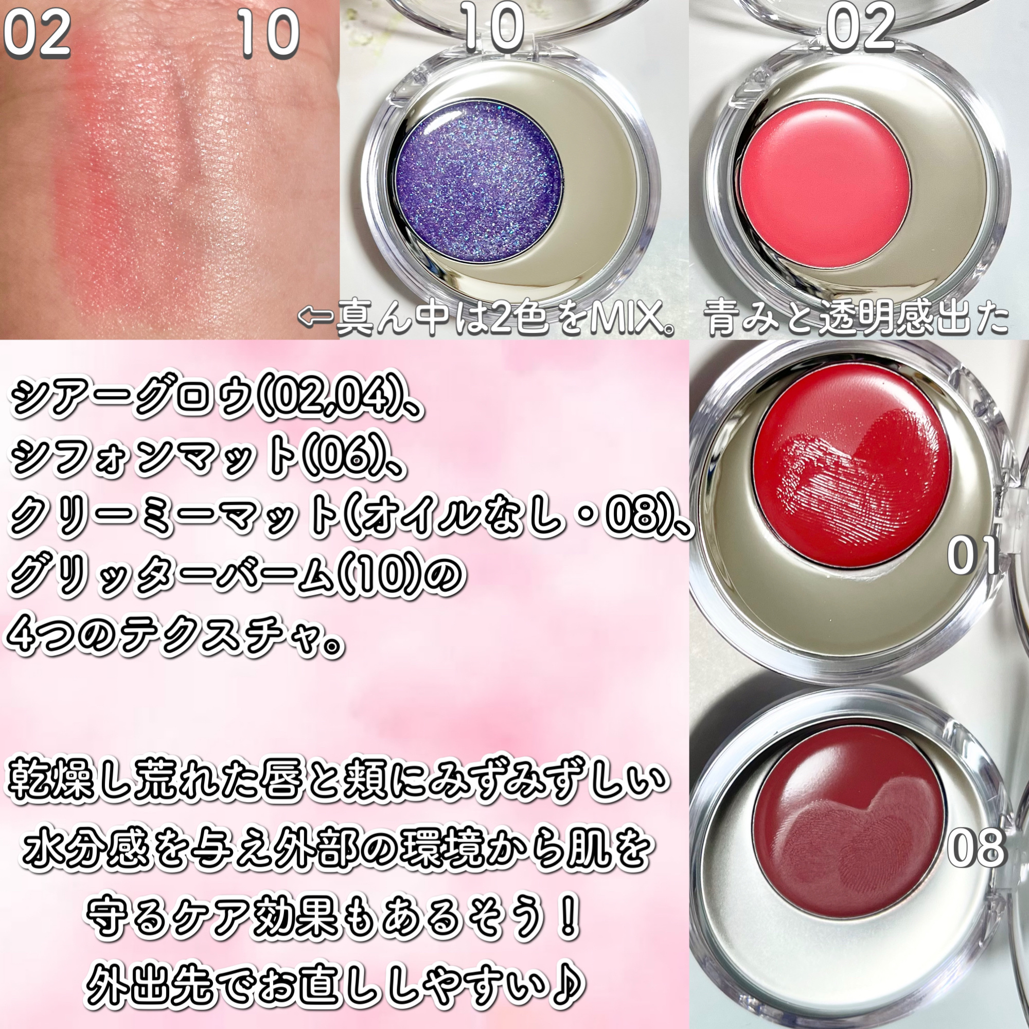 指先から始まるメルティングフォーミュラで手だけで簡単メイクアップ! じゅわっと溶けるバームタイプ❤︎ バームのジュワッと感が本当に可愛くて1度使うとハマっちゃう! 韓国アイドルの艶感のあるぷるぷるチークメイクをしたい方にもってこいだと思う!❤︎