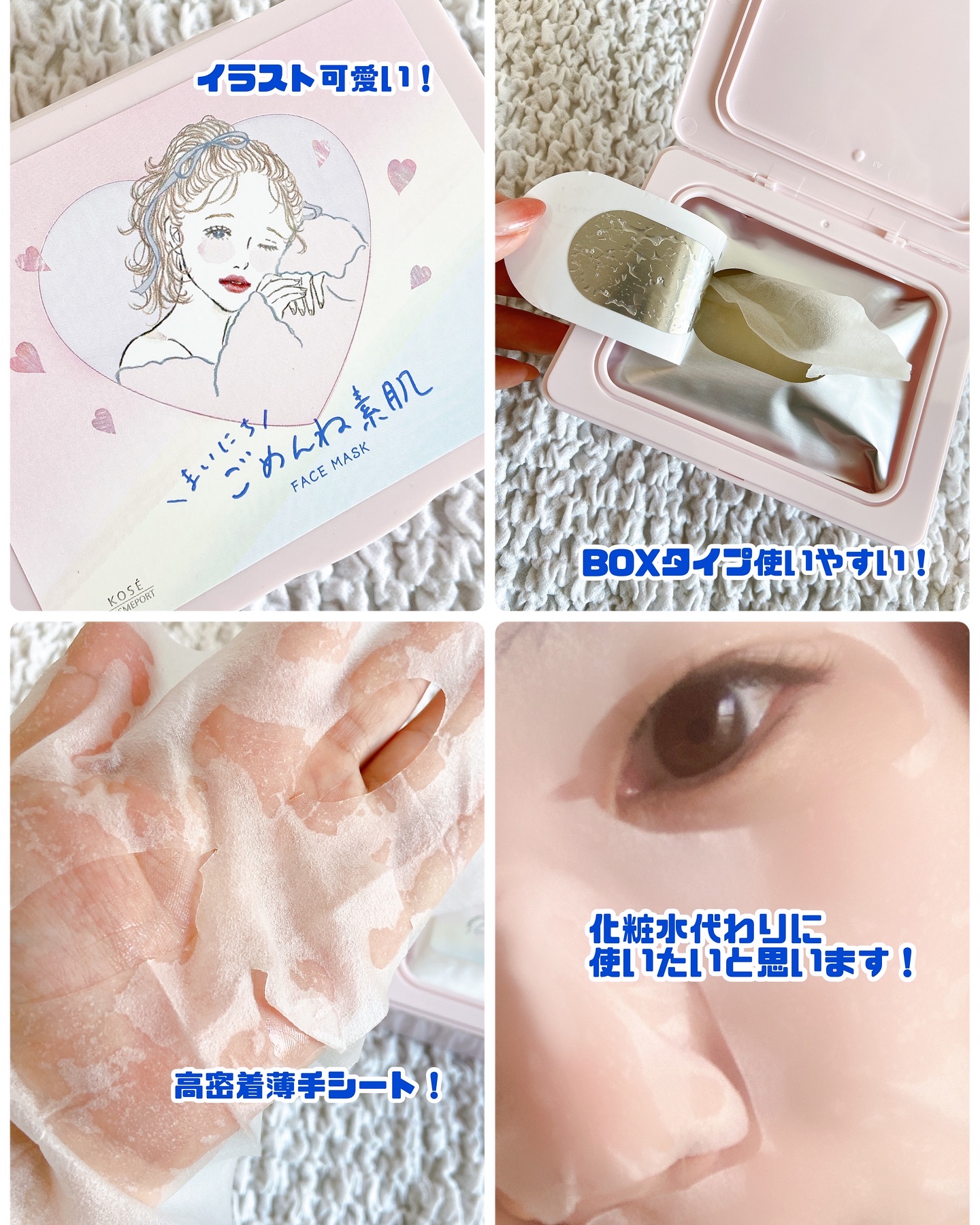 - 毎日の化粧水代わりに 敏感・あれがちな肌を速攻うるおいリペア*できる 『まいにちごめんね素肌マスク』 ①化粧水代わりのクイックケアで、負担をかけがちな肌を速攻うるおいリペア* たった3分のクイックケアで美容液がたっぷり浸透*1✨ 外的ストレスや*2不規則な生活の影響を受けやすい肌も健やかな肌へ♪ ②あれがちな肌にもやさしい使い心地。低刺激設計 弱酸性・無香料・無着色・無鉱物油・アルコールフリー・パラベンフリー・紫外線吸収剤フリー・シリコーンフリーの低刺激処方。やさしい使い心地です。 *お手入れのこと *1角層まで *2乾燥による刺激のこと