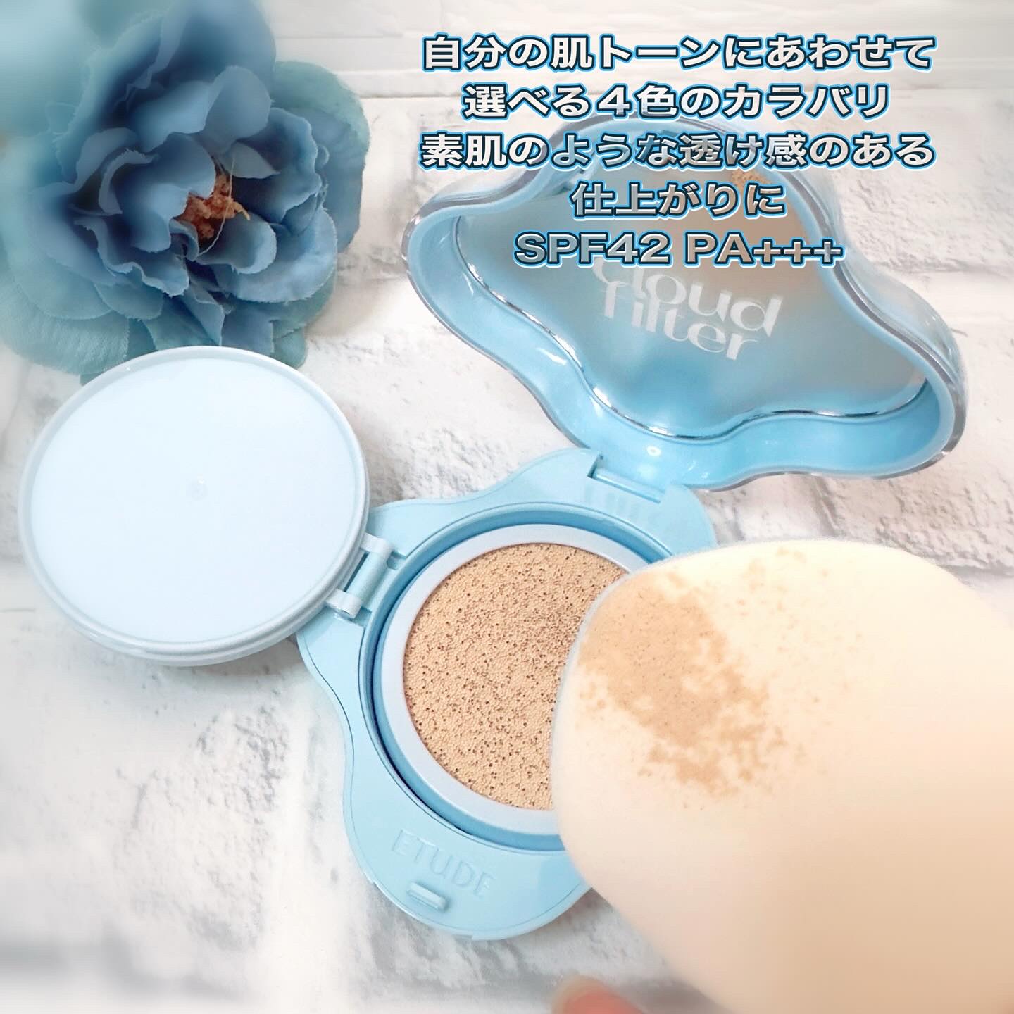 うぶ肌を演出してくれる、パッケージも可愛いクラウドフィルタークッション💕 数々のTOPアイドルのメイクを担当している「Kitts」との共同開発によって誕生した新作ファンデーションなんだって👀 ブルーパウダー*を配合しているから透き通るような*²肌を演出してくれるよ🫶