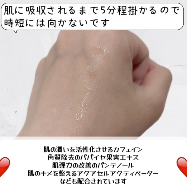 | しばらくすると馴染んで表面もサラっとして、水分を含んだぷるぷるのお肌に♪ | 詳細を見る | |