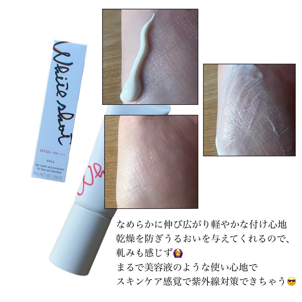 日中も、美白※1・美肌ケアをとめない ✔️クレンジング不要で洗顔料だけで落とせる処方設計に加え、ファンデーションのもちを良くする下地機能、さらにファンデーションの上から重ね塗りできる化粧上地の機能もプラスしているそう 伸びの良いなめらかなテクスチャー。まるで美容液のような、きしみ感のない軽やかなつけ心地です。 ツヤと透明感※3のある仕上がりも好みで、私はお休みの日はこれだけで過ごす事も。