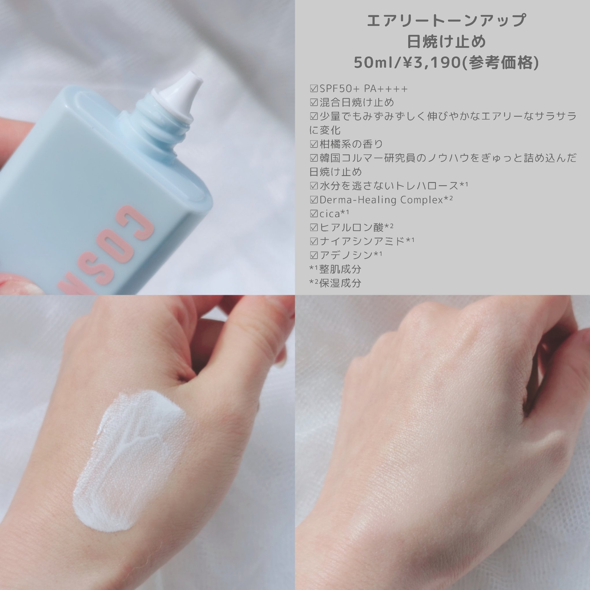 肌のトーンを整える混合タイプの日焼け止めセラムです。初めて使用した時の感想はとにかくサラサラ! ゆるめのテクスチャーで、なじませていくうちにサラッサラになります。 潤いも与えてくれるので乾燥する感じはなし◎ しっかりトーンアップしてくれる! 軽い使い心地だから日焼け止めを塗った感はなく、夏に使うのが楽しみ!