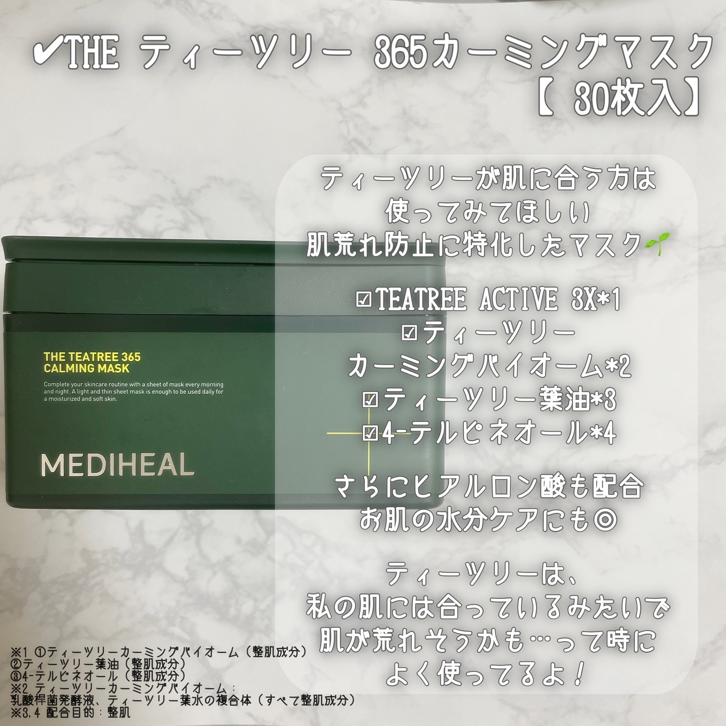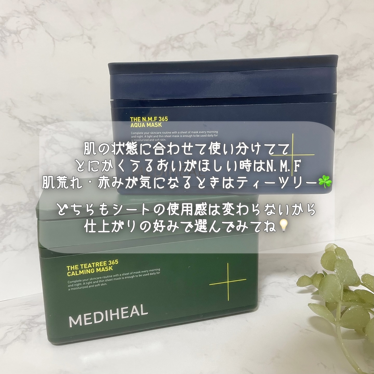 メディヒールの大容量30枚入り365マスク✨ ティーツリーとN.M.Fの2種類から選べます◎ 薄くてやわらかいヴィーガンエアーフィットシートにさらっとしたエッセンスがひたひたに抱え込まれてる🫂 ティーツリーマスクはさっぱりトラブルケアをしたい方、N.M.Fマスクは水分たっぷりうるおいケアをしたい方におすすめです🫶