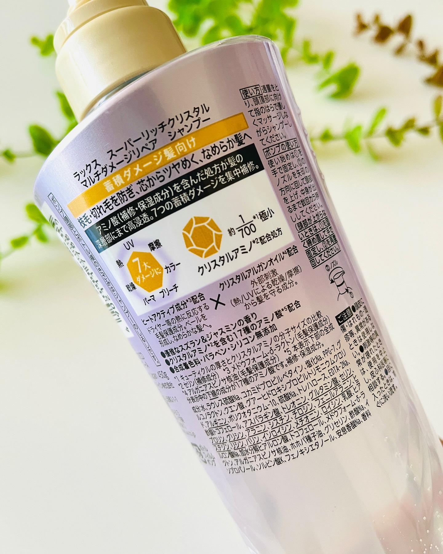 まばゆいほど、光をふりまくツヤ満ち髪へ✨ 7大ダメージを集中補修。 (UV, 熱、乾燥, パーマ, ブリーチ, カラー、摩擦によるダメージ) 緩めのテクスチャーで、ふわふわと泡立ちがよく、髪全体を包みこんでくれます🫧 シャンプーだけでもしっとりとした仕上がりです🩷 ツヤ感をロックしてくれる処方だそう✨ べたつかず、軽やかな仕上がりがお気に入り🩷