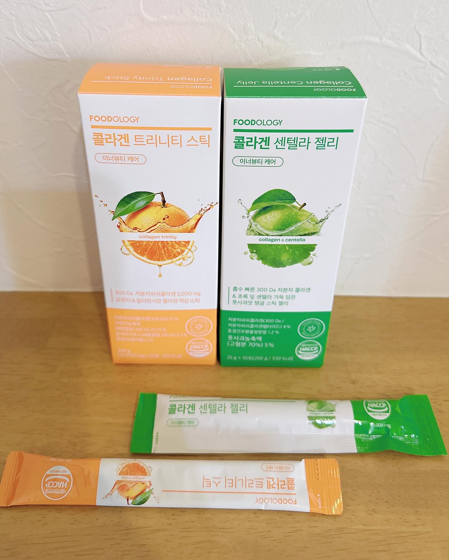 韓国オリーブヤング1位・Qoo10 1位のダイエットで有名なフードオロジーから肌ケアの新商品が発売✨ コラーゲンとセンテラ(ツボクサ:シカ)で潤いとハリのあるしっとり肌に⭐️ 青りんご味のぷるぷるしたコラーゲンゼリーですごく美味しいです🥰 高合量コラーゲンで弾力ケア💗 ぷりぷり感のあるお肌に⭐️ オレンジ味の液状タイプ🍊濃いオレンジジュースのような味で飲みやすかったです☺️