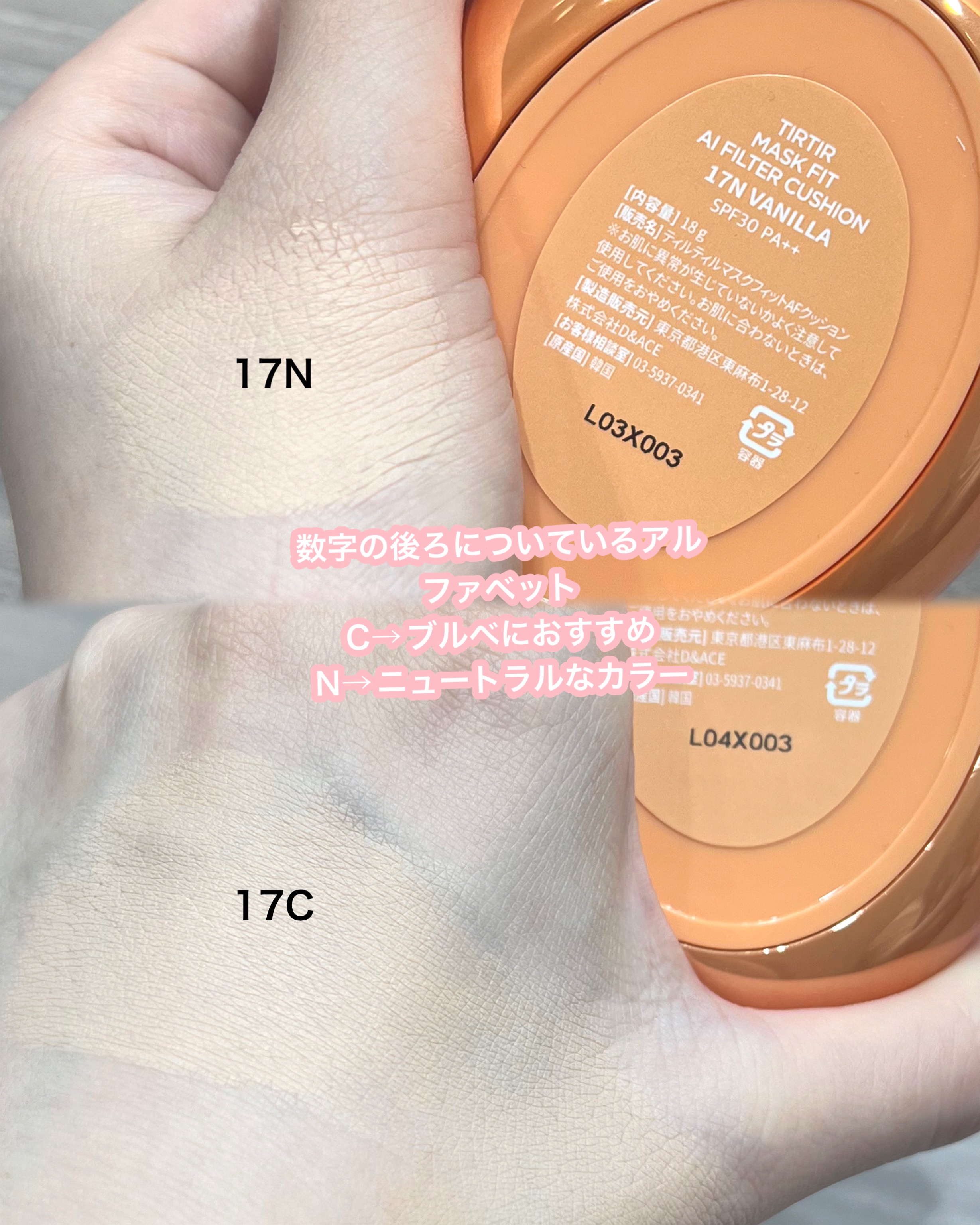 - <17C> 水、酸化チタン、シクロペンタシロキサン、トリメチルシロキシケイ酸、メチルトリメチコン、BG、ジメチコン、変性アルコール、ナイアシンアミド、(C18-21)アルカン、ヘプタン酸ステアリル、(ジメチコン/(PEG-10/15))クロスポリマー、ラウリルPEG-9ポリジメチルシロキシエチルジメチコン、塩化Na、水酸化Al、プロパンジオール、トリ(カプリル酸/カプリン酸)グリセリル、グリセリン、ステアリン酸、トリエトキシカプリリルシラン、ポリヒドロキシステアリン酸、カプリリルグリコール、トリイソステアリン酸イソプロピルチタン、(ビスPEG-15ジメチコン/IPDI)コポリマー、カプリル酸グリセリル、香料、(サッカロミセス/キシリヌム)/紅茶培養物、エチルヘキシルグリセリン、ステアラルコニウムヘクトライト、1,2-ヘキサンジオール、ポリリシノレイン酸ポリグリセリル-3、パルミチン酸エチルヘキシル、ミリスチン酸イソプロピル、イソステアリン酸、レシチン、ジイソステアリン酸ポリグリセリル-3、アデノシン、エチレンジアミンジコハク酸3Na、(アクリレーツ/ジメチコン)コポリマー、アロエベラ葉エキス、ヤマノイモ根エキス、マコンブエキス、ウルムスダビディアナ根エキス、スミレ花エキス、PEG-2ソイアミン、DPG、ホホバ種子油、酸化クロム、グンジョウ、クエン酸Na、PEG-10ジメチコン、セラミドNP、セテアリルアルコール、コーヒー種子エキス、ユーカリ葉エキス、ゲッケイジュ葉エキス、シリカ、カカオ種子エキス、(ビニルジメチコン/メチコンシルセスキオキサン)クロスポリマー、トコフェロール、コレステロール、カオリン、乳酸桿菌発酵液、アスコルビン酸、ビオチン、カルニチンHCl、葉酸、ナイアシン、パントテン酸、パルミチン酸レチノール、リボフラビン、チアミンHCl[+/-]酸化鉄 <21N> 水、酸化チタン、シクロペンタシロキサン、トリメチルシロキシケイ酸、メチルトリメチコン、BG、ジメチコン、変性アルコール、ナイアシンアミド、(C18-21)アルカン、ヘプタン酸ステアリル、(ジメチコン/(PEG-10/15))クロスポリマー、ラウリルPEG-9ポリジメチルシロキシエチルジメチコン、塩化Na、水酸化Al、プロパンジオール、トリ(カプリル酸/カプリン酸)グリセリル、グリセリン、ステアリン酸、トリエトキシカプリリルシラン、ポリヒドロキシステアリン酸、カプリリルグリコール、トリイソステアリン酸イソプロピルチタン、(ビスPEG-15ジメチコン/IPDI)コポリマー、カプリル酸グリセリル、香料、(サッカロミセス/キシリヌム)/紅茶培養物、エチルヘキシルグリセリン、ステアラルコニウムヘクトライト、1,2-ヘキサンジオール、ポリリシノレイン酸ポリグリセリル-3、パルミチン酸エチルヘキシル、ミリスチン酸イソプロピル、イソステアリン酸、レシチン、ジイソステアリン酸ポリグリセリル-3、アデノシン、エチレンジアミンジコハク酸3Na、(アクリレーツ/ジメチコン)コポリマー、アロエベラ葉エキス、ヤマノイモ根エキス、マコンブエキス、ウルムスダビディアナ根エキス、スミレ花エキス、PEG-2ソイアミン、DPG、ホホバ種子油、酸化クロム、グンジョウ、クエン酸Na、PEG-10ジメチコン、セラミドNP、セテアリルアルコール、コーヒー種子エキス、ユーカリ葉エキス、ゲッケイジュ葉エキス、シリカ、カカオ種子エキス、(ビニルジメチコン/メチコンシルセスキオキサン)クロスポリマー、トコフェロール、コレステロール、カオリン、乳酸桿菌発酵液、アスコルビン酸、ビオチン、カルニチンHCl、葉酸、ナイアシン、パントテン酸、パルミチン酸レチノール、リボフラビン、チアミンHCl[+/-]酸化鉄 <23N> 水、酸化チタン、シクロペンタシロキサン、トリメチルシロキシケイ酸、メチルトリメチコン、BG、ジメチコン、変性アルコール、ナイアシンアミド、(C18-21)アルカン、ヘプタン酸ステアリル、(ジメチコン/(PEG-10/15))クロスポリマー、ラウリルPEG-9ポリジメチルシロキシエチルジメチコン、塩化Na、水酸化Al、プロパンジオール、トリ(カプリル酸/カプリン酸)グリセリル、グリセリン、ステアリン酸、トリエトキシカプリリルシラン、ポリヒドロキシステアリン酸、カプリリルグリコール、トリイソステアリン酸イソプロピルチタン、(ビスPEG-15ジメチコン/IPDI)コポリマー、カプリル酸グリセリル、香料、(サッカロミセス/キシリヌム)/紅茶培養物、エチルヘキシルグリセリン、ステアラルコニウムヘクトライト、1,2-ヘキサンジオール、ポリリシノレイン酸ポリグリセリル-3、パルミチン酸エチルヘキシル、ミリスチン酸イソプロピル、イソステアリン酸、レシチン、ジイソステアリン酸ポリグリセリル-3、アデノシン、エチレンジアミンジコハク酸3Na、(アクリレーツ/ジメチコン)コポリマー、アロエベラ葉エキス、ヤマノイモ根エキス、マコンブエキス、ウルムスダビディアナ根エキス、スミレ花エキス、PEG-2ソイアミン、DPG、ホホバ種子油、酸化クロム、グンジョウ、クエン酸Na、PEG-10ジメチコン、セラミドNP、セテアリルアルコール