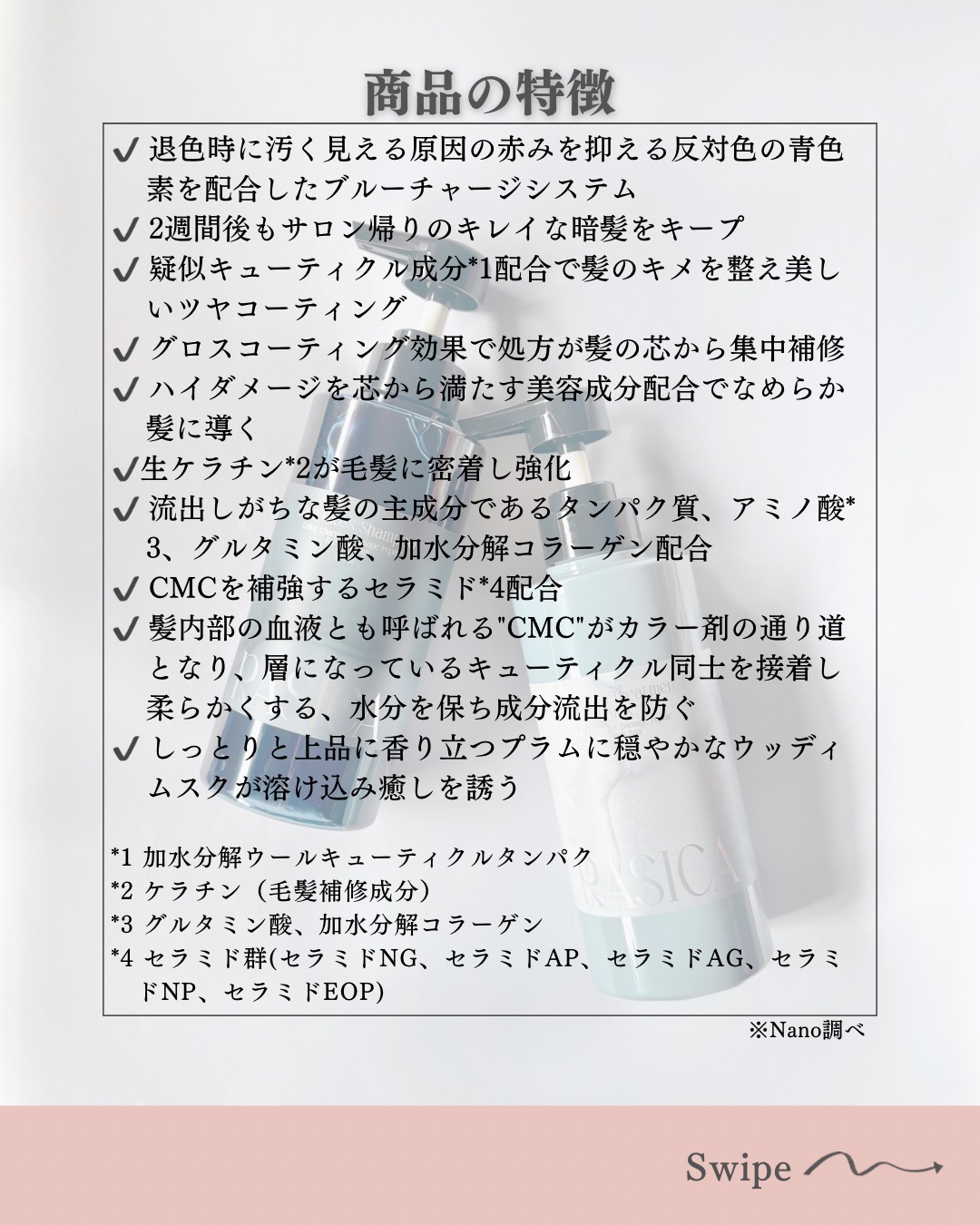 - <シャンプー380ml> 水、コカミドプロピルベタイン、ラウロイルメチルアラニンNa、ココイルメチルタウリンNa、塩化Na、DPG、加水分解コンキオリンタンパク、加水分解ヒアルロン酸、ケラチン(羊毛)、加水分解ケラチン(羊毛)、加水分解水添デンプン、加水分解コラーゲン、水添レシチン、グリコシルトレハロース、ユズ果実エキス、アルギン酸Na、フィトステロールズ、γ-ドコサラクトン、クオタニウム-33、セラミドNG、セラミドAG、セラミドNP、セラミドAP、セラミドEOP、ソルビトール、ラウロイル加水分解シルクNa、グリチルリチン酸2K、デシルグルコシド、ベタイン、ポリクオタニウム-10、コカミドMEA、コカミドDEA、ジステアリン酸PEG-150、PCAイソステアリン酸PEG-40水添ヒマシ油、ジステアリルジモニウムクロリド、ベヘントリモニウムクロリド、BG、PG、プロパンジオール、コレステロール、リンゴ酸、メントール、エタノール、EDTA-2Na、安息香酸Na、サリチル酸、香料、塩基性青99、塩基性紫2 <トリートメント 01 380g> 水、DPG、セテアリルアルコール、オリーブ果実油、ジメチコン、ベヘントリモニウムクロリド、加水分解コンキオリンタンパク、加水分解ヒアルロン酸、ケラチン(羊毛)、加水分解ケラチン(羊毛)、加水分解水添デンプン、加水分解コラーゲン、加水分解シルク、水添レシチン、グリコシルトレハロース、ユズ果実エキス、アルギン酸Na、γ-ドコサラクトン、セラミドNG、セラミドAG、セラミドNP、セラミドAP、セラミドEOP、フィトステロールズ、スクレロカリアビレア種子油、アーモンド油、ポリクオタニウム-92、クオタニウム-33、カエサルピニアスピノサヒドロキシプロピルトリモニウムクロリド、ソルビトール、ヒアルロン酸Na、ベタイン、ビスジグリセリルポリアシルアジペート-2、セタノール、ステアリルアルコール、ベヘニルアルコール、コレステロール、ステアロキシプロピルトリモニウムクロリド、ジステアリルジモニウムクロリド、乳酸、クエン酸、ジグリセリン、BG、PG、プロパンジオール、イソプロパノール、アモジメチコン、アミノプロピルジメチコン、EDTA-2Na、安息香酸Na、香料、HC青15、塩基性青99、塩基性紫2 <トリートメント 02 380g> 水 、DPG 、セテアリルアルコール 、オリーブ果実油 、ジメチコン 、ベヘントリモニウムクロリド 、加水分解コンキオリンタンパク 、加水分解ヒアルロン酸 、ケラチン(羊毛) 、加水分解ケラチン(羊毛) 、加水分解水添デンプン 、加水分解コラーゲン 、加水分解シルク 、水添レシチン 、グリコシルトレハロース 、ユズ果実エキス 、アルギン酸Na 、γ-ドコサラクトン 、セラミドNG 、セラミドAG 、セラミドNP 、セラミドAP 、セラミドEOP 、フィトステロールズ 、スクレロカリアビレア種子油 、アーモンド油 、ポリクオタニウム-92 、クオタニウム-33 、カエサルピニアスピノサヒドロキシプロピルトリモニウムクロリド 、ソルビトール 、ヒアルロン酸Na 、ベタイン 、ビスジグリセリルポリアシルアジペート-2 、セタノール 、ステアリルアルコール 、ベヘニルアルコール 、コレステロール 、ステアロキシプロピルトリモニウムクロリド 、ジステアリルジモニウムクロリド 、乳酸 、クエン酸 、ジグリセリン 、BG 、PG 、プロパンジオール 、イソプロパノール 、アモジメチコン 、アミノプロピルジメチコン 、EDTA-2Na 、安息香酸Na 、香料 、HC青15 、塩基性青99 、塩基性紫2