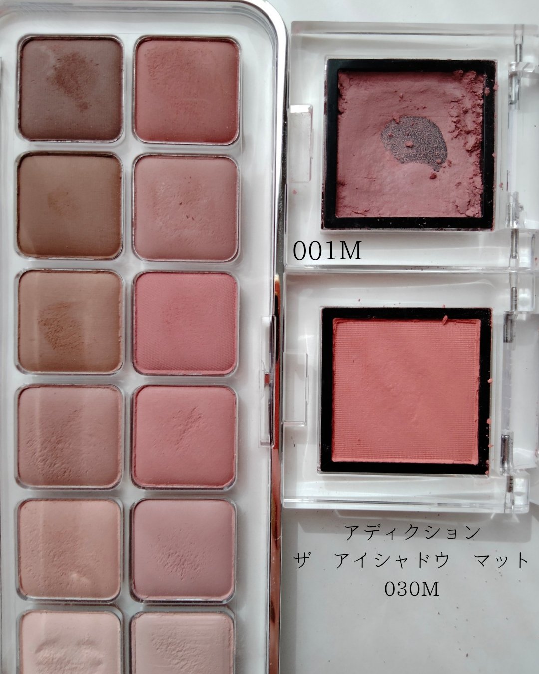 こちらのパレットは、くすみの得意な方ならほぼ捨て色無しのマットパレットです。手持ちのマットアイシャドウと比較しても似たような色が勢ぞろい。 このパレットはなんといってもシェーディングとして優秀です!!!春のふわ〜〜としたメイクをして、蟹味噌シェーディングが強すぎる場合はこういうパレットで影をいれると可愛く仕上がります。