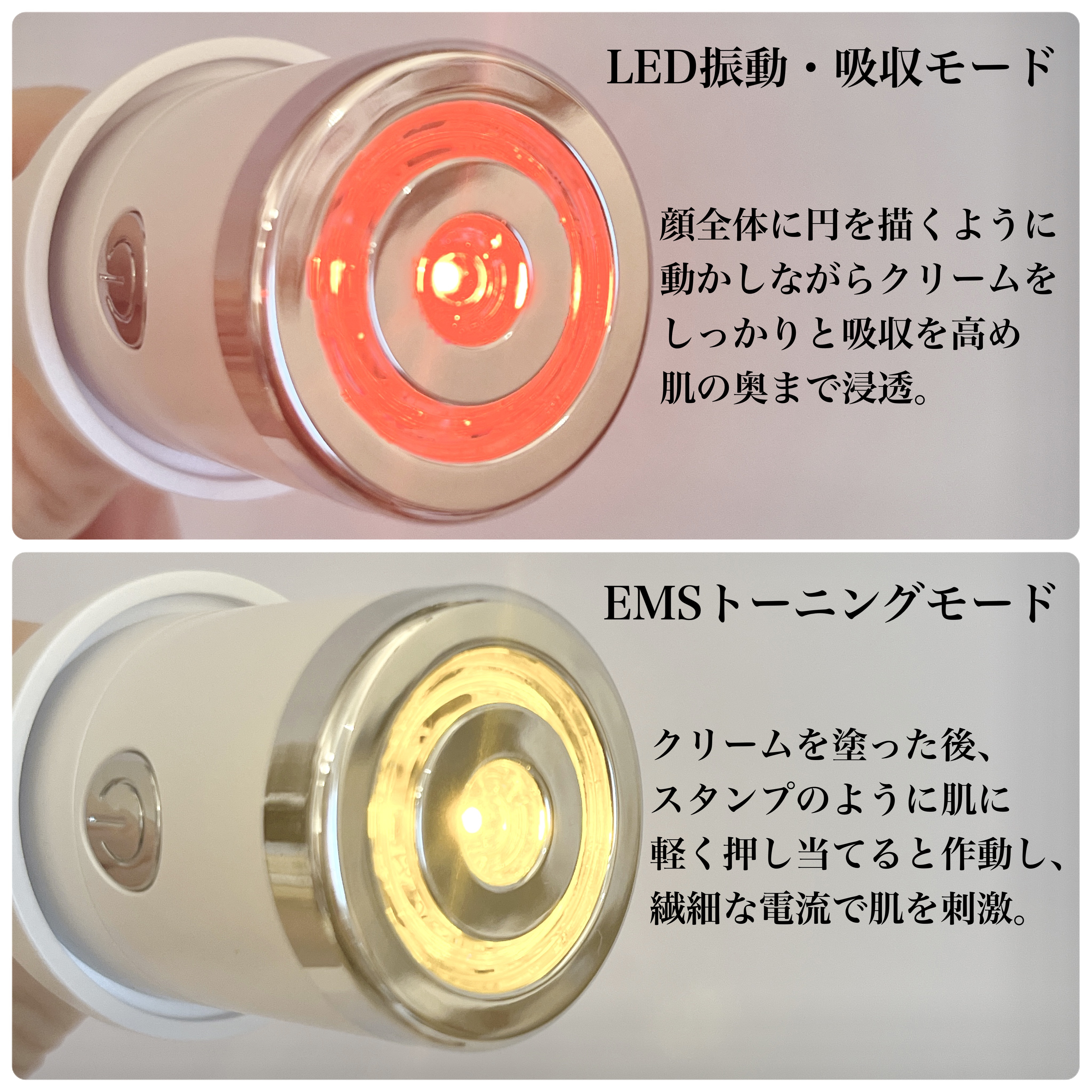 たまごみたいなクリームと美顔器が一体に🥚 クリームと美顔器の相乗効果で、肌への浸透をさらに高めるトーンアップクリームでくすみケア。 EMSトーニングモード マイクロカレント(微細電流)で水溶性の有効な美容成分を肌の深部まで浸透させ、肌のトーンや弾力UP ホワイトトマト水とピュアグルタチオンの複合成分の独特の香りも特徴的なので、好みは分かれそう。