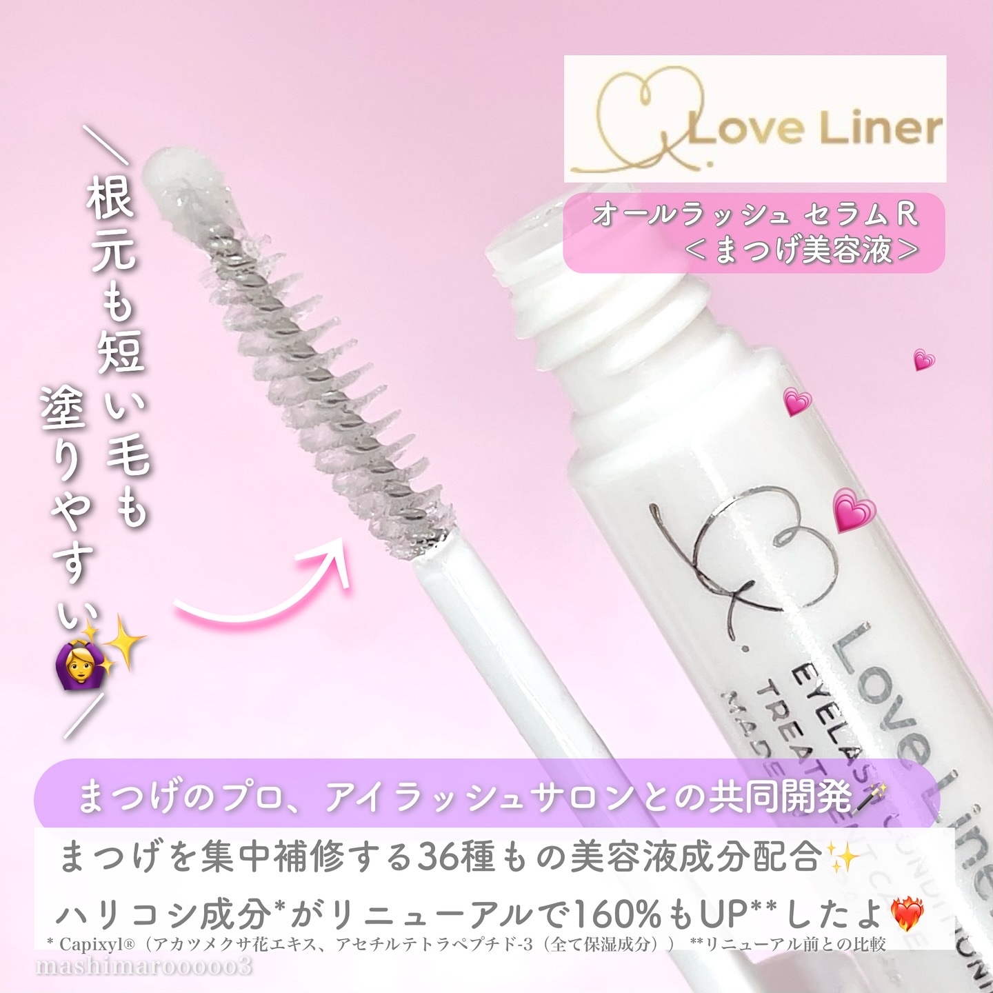業界トップクラスのまつげエクステ・専門サロンを運営する「プロケアラボ社」との共同開発🌸 ラブ・ライナーオールラッシュセラムR<まつげ美容液> 毛周期に着目した成分をブレンドしたラッシュサイクルメソッド採用で、よりよい毛周期に✨️ まつげにハリ・コシを与える成分Capixyl®を従来品と比較して160%に増量⤴︎︎⤴︎︎😍💓 チップとスクリューブラシが一体のハイブリッドブラシ採用で、まつげの根元から短い毛まで塗りやすいのが嬉しい♥️