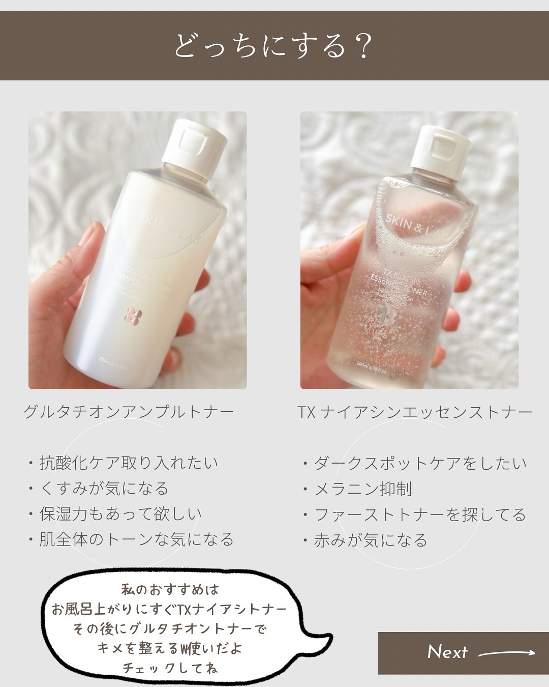 TXナイアシントナーはトラネキサム酸、ナイアシンアミド配合でWダークスポットケア。 シャバシャバでさっぱりしたお水みたいなテクスチャーでベタつかずお肌にぐんぐん馴染みます。 グルタチオントナーは純度99%のグルタチオン配合でくすみをケア。 とろっとしたアンプルとトナーの間のようなテクスチャーで保湿力がありもちっとした肌触りに。 両方使うことで肌全体のトーンとダークスポットを同時にケア。 夏に向けてしっかりケアしたい方におすすめです。